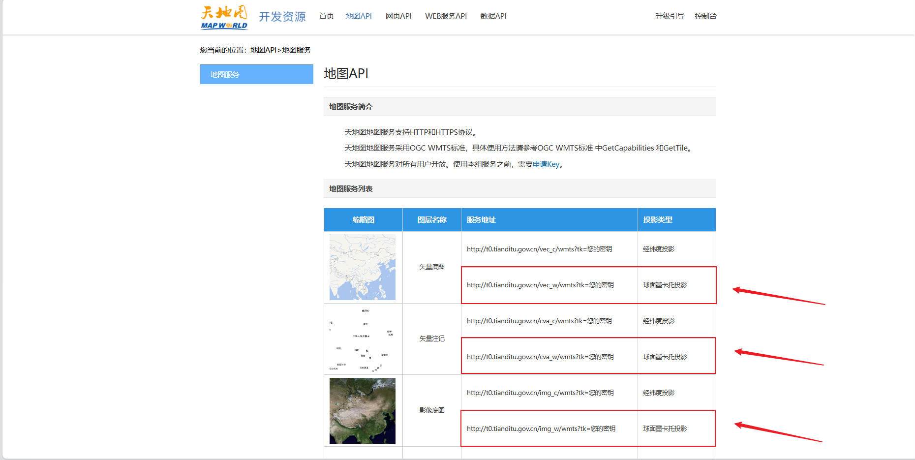 3)在打开页面中复制所需底图的服务地址,并替换获取的key,得到一个新地址。