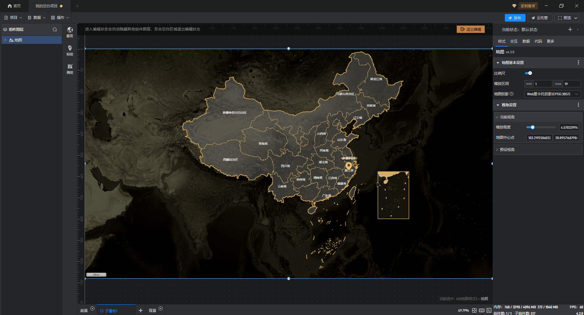| 地图投影 | 选择地图的投影方式,地图图层会自动转化为此地图投影。共有两种投影方式,分别是“Web 墨卡托投影(EPSG:3857)”和“平面 Carree 投影(EPSG:4326)”,默认投影方式为“Web 墨卡托投影(EPSG:3857)” |
