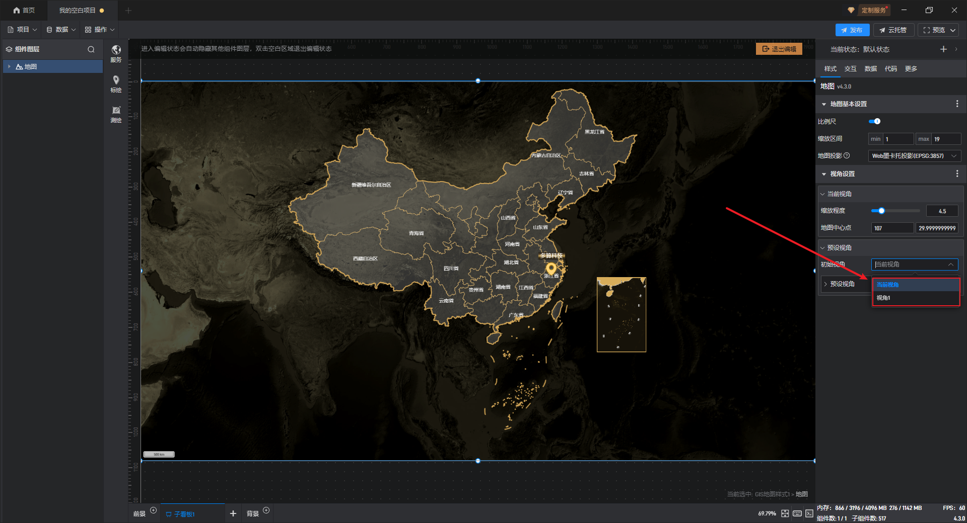 | 初始视角 | 代表地图打开时的默认视角,可以从预先设置好的视角中进行选择,默认值为“当前视角”。 |