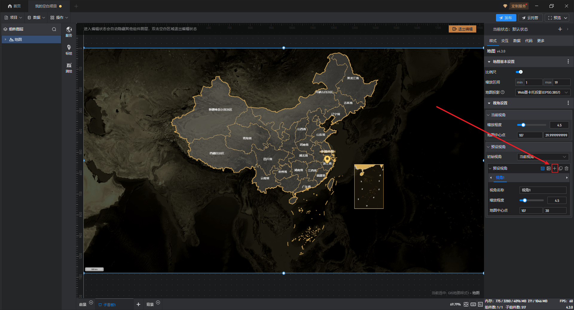 如果想要通过点击按钮实现“切换视角”的效果,可以给按钮添加交互,选择自定义动作,然后给地图组件里的“场景”设置“切换预设视角”。