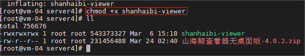将山海鲸查看器无桌面系统版设置为可执行文件,输入命令:
