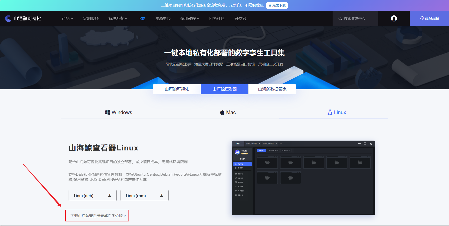 在山海鲸可视化官网中下载山海鲸查看器无桌面系统版安装包,下载完成后将安装包复制到需要部署的 Linux 服务器中。