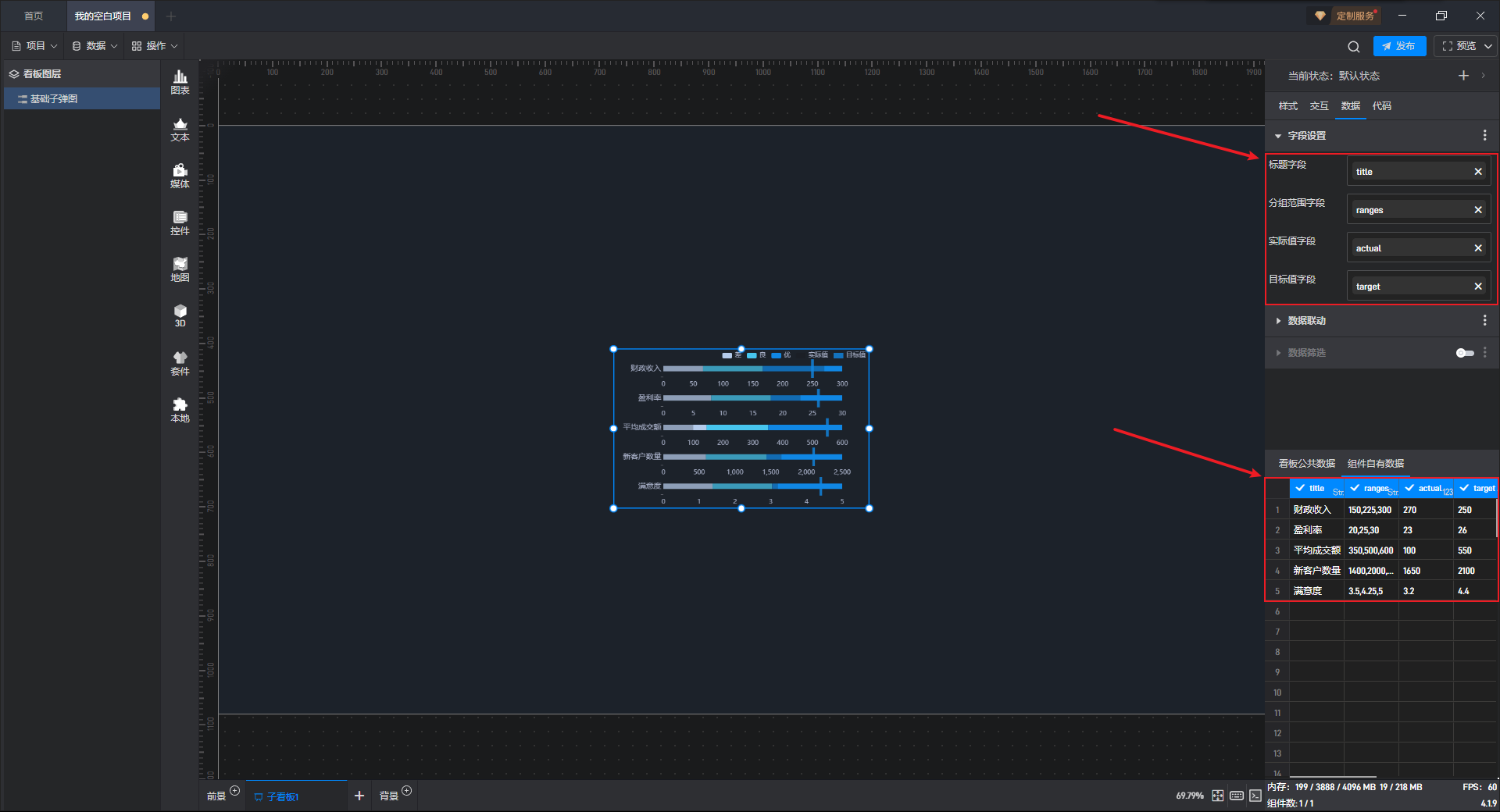 | 标题字段(类别) | 分组范围字段 | 实际值字段 | 目标值字段 |