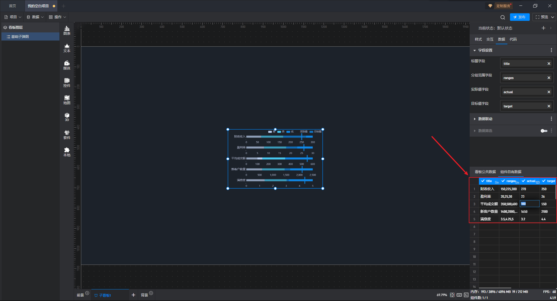 在“数据”设置界面下方可以直接修改数据,组件中的数据也会实时更新。