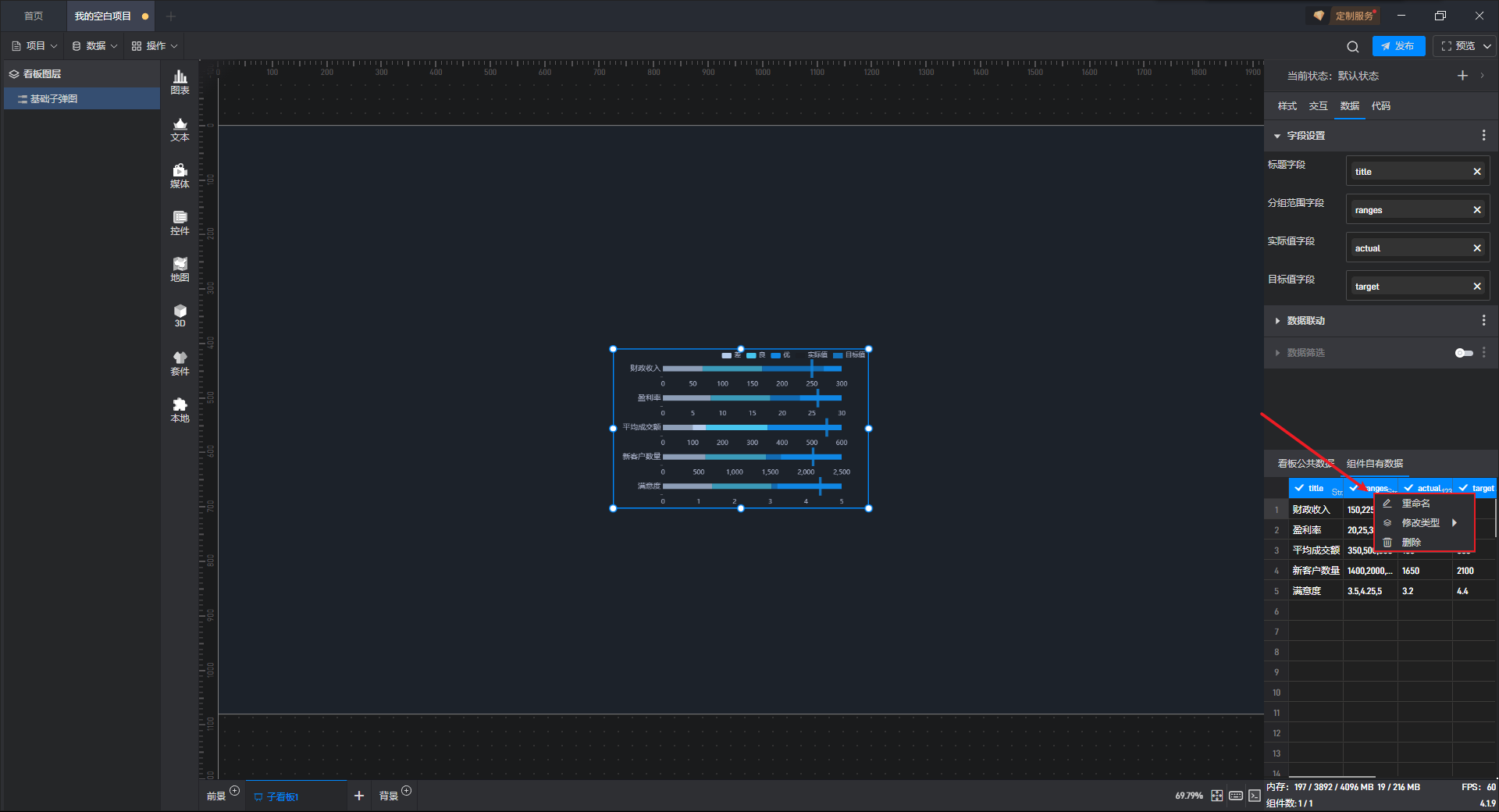 其中标题字段和分组范围字段的数据类型是字符串类型,实际值字段和目标值字段的数据类型是数字类型。