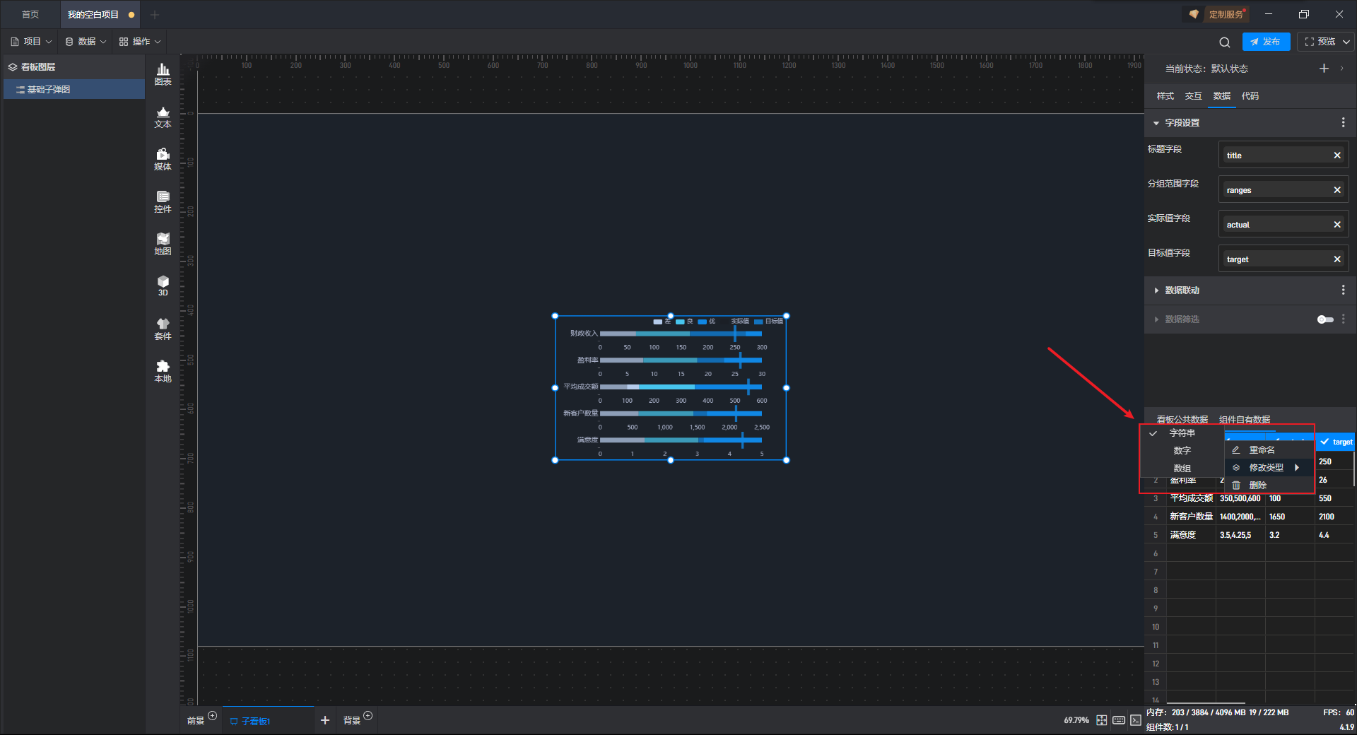 字段类型包括:字符串、数字和数组(数据字段是字符串类型,数字类型用于数值,数组类型用于词云组件),只有在字段类型正确的情况下,组件内容才能正常显示。
