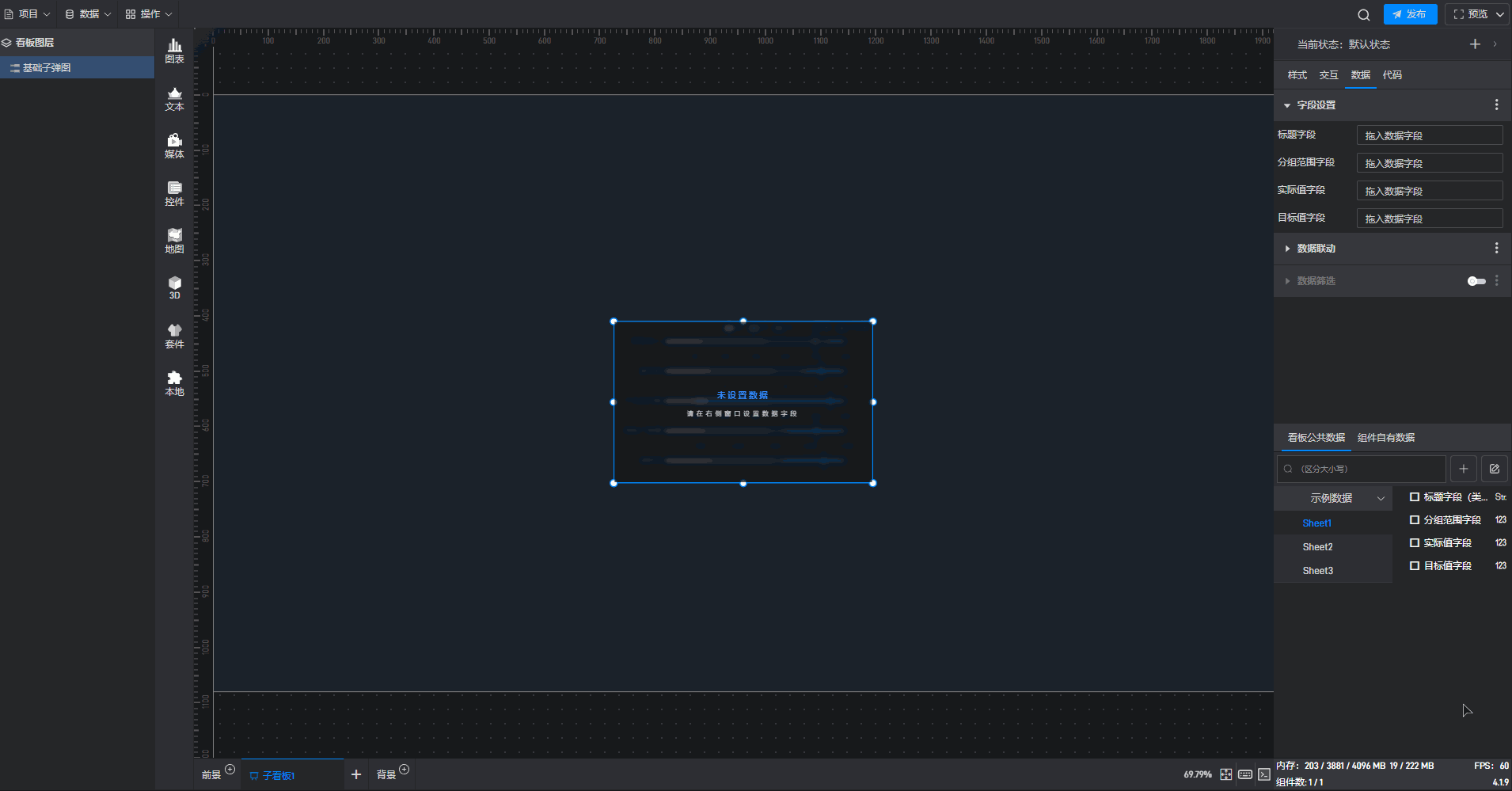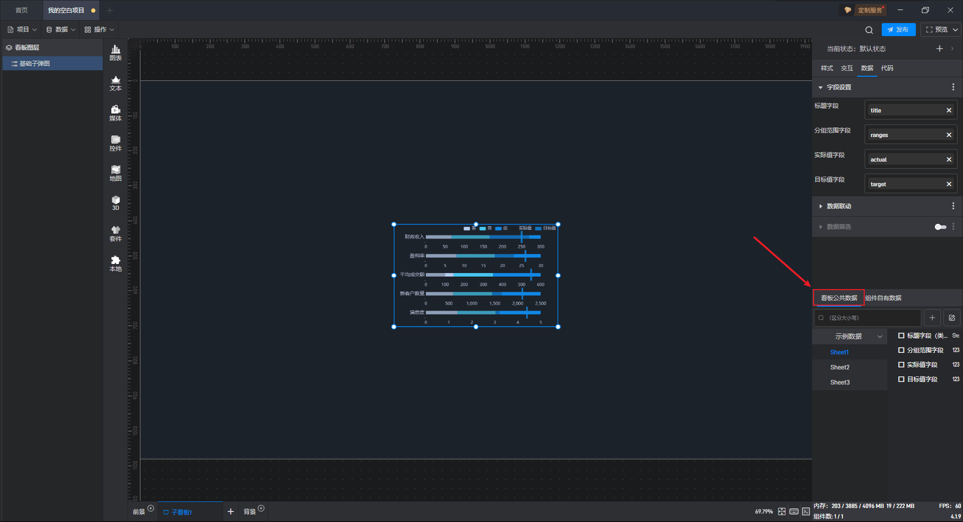 点击选中组件,在右侧“数据”设置窗口中切换到“看板公共数据”(同一个项目中所有数据源是共享的)。
