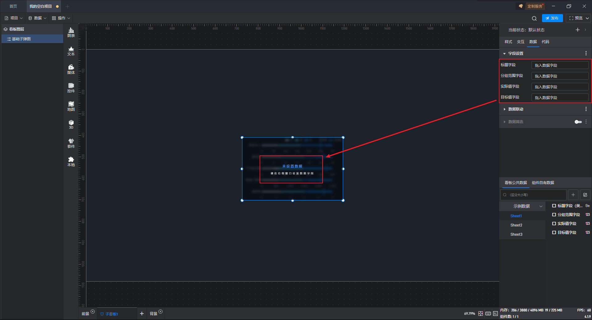 单击选中组件,在右侧“数据”设置窗口中,可以看到组件已经设置好了数据字段,且数据字段来自于“组件自有数据”。