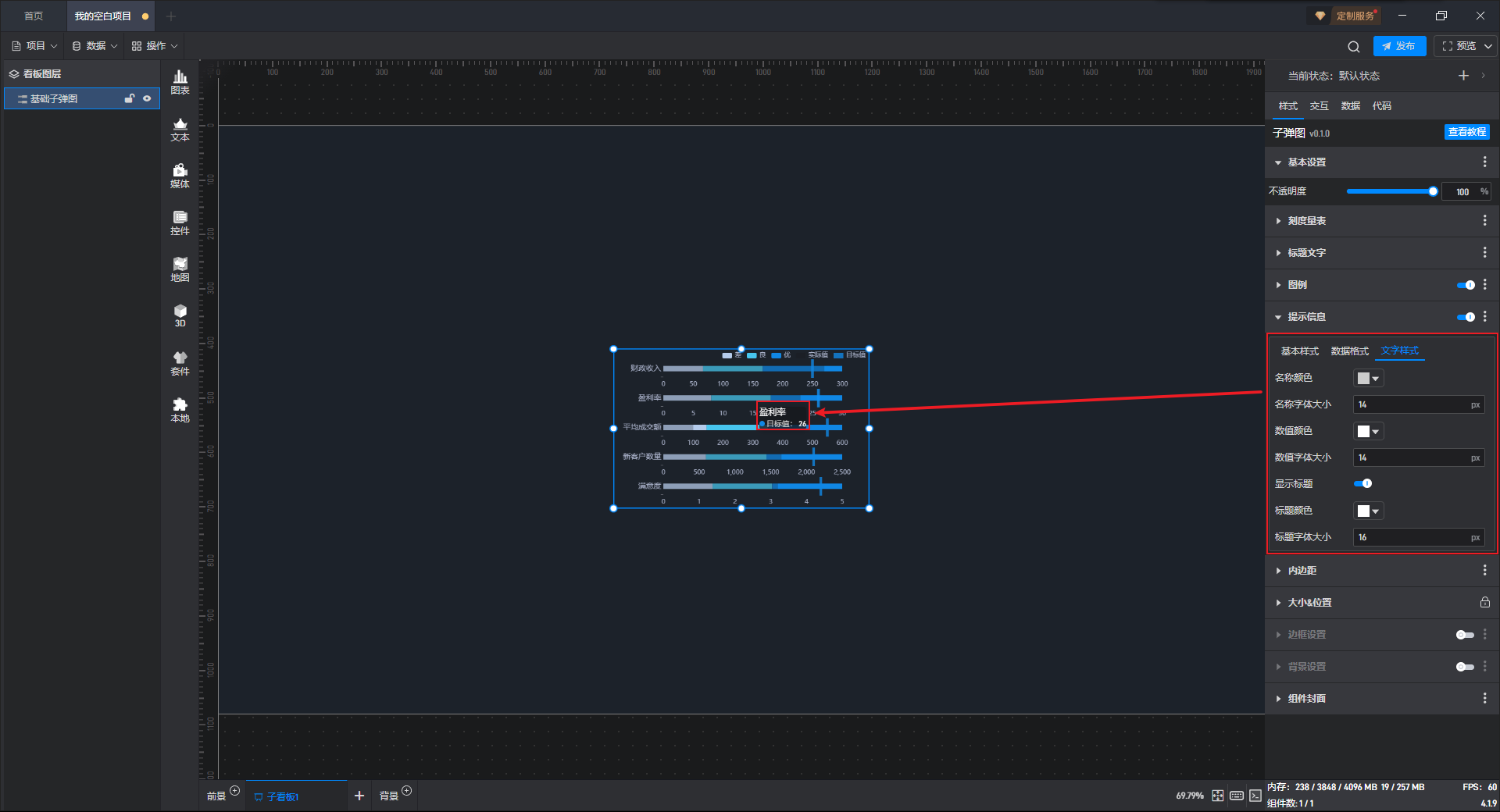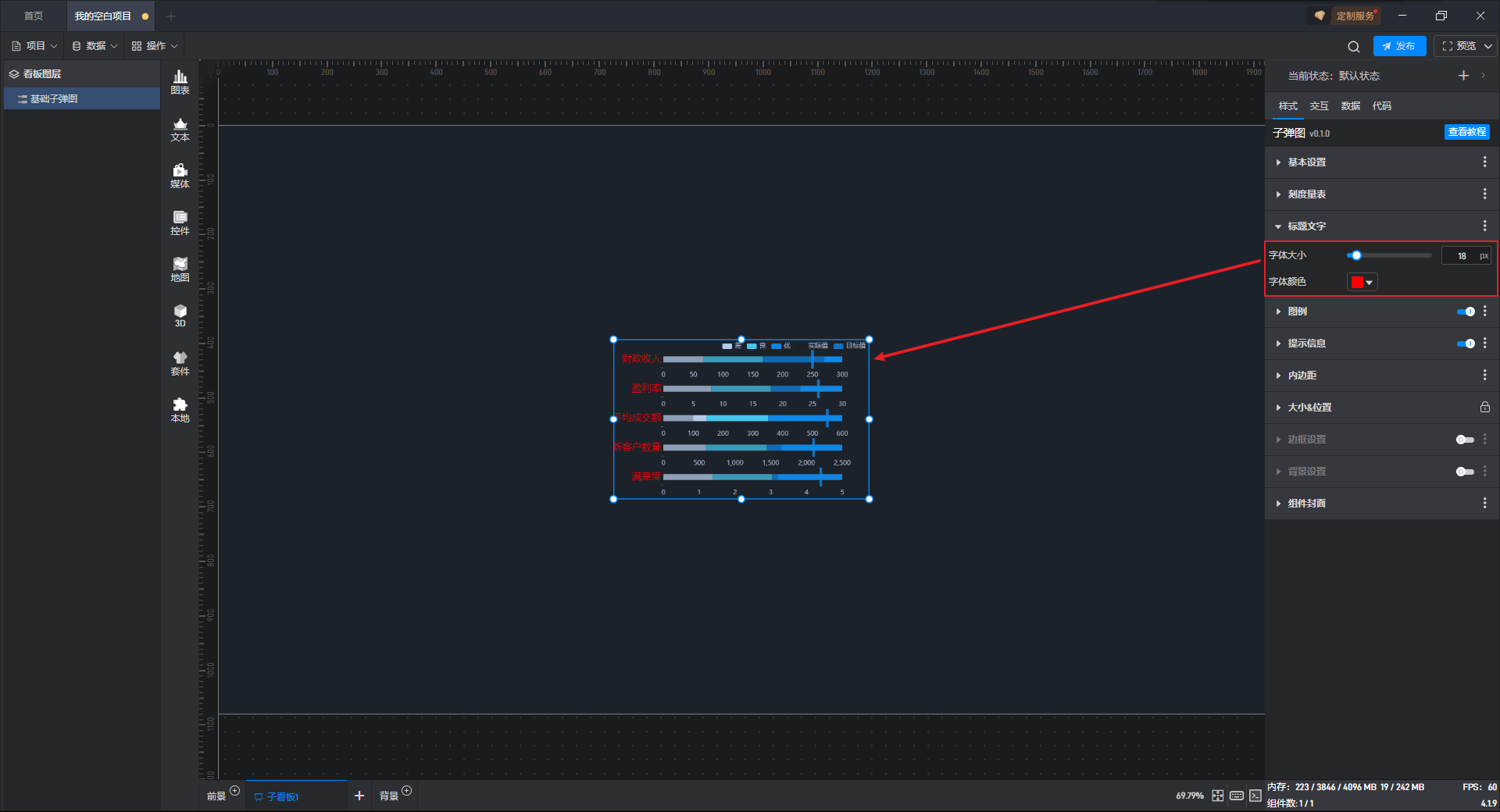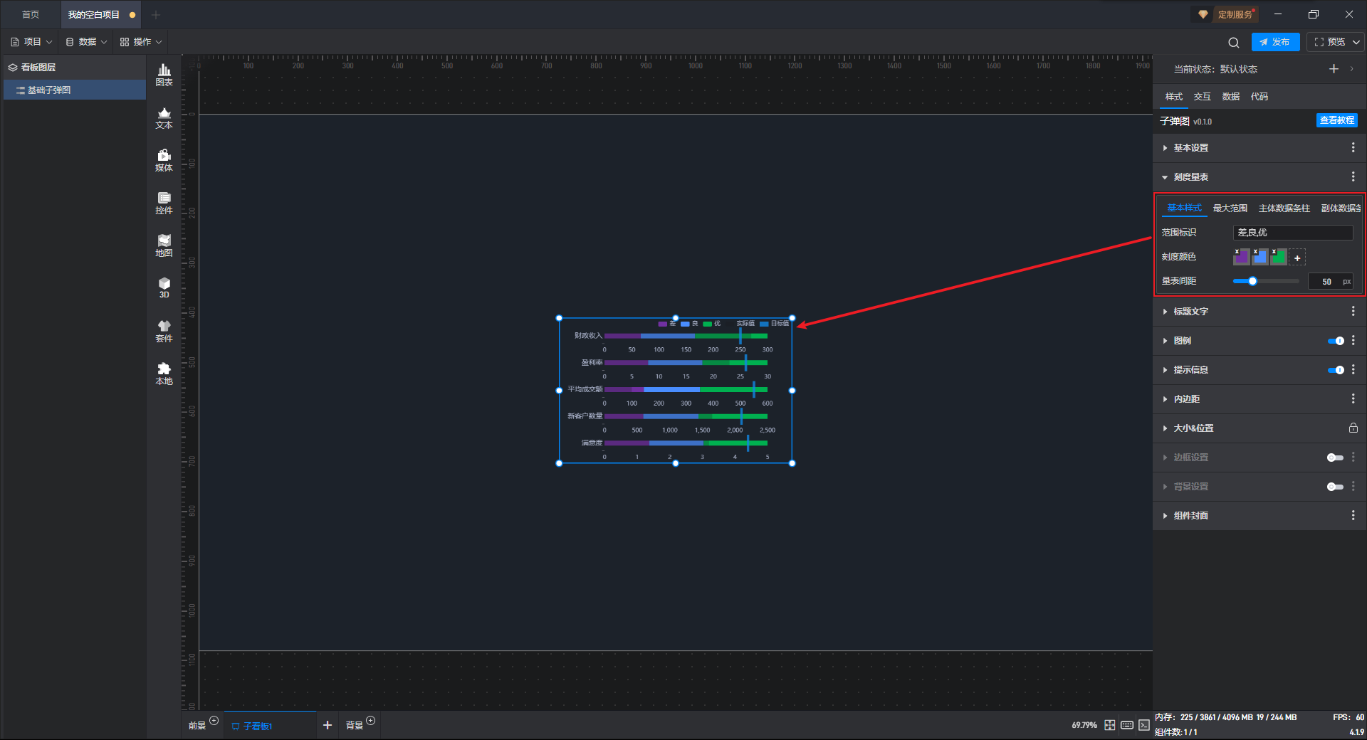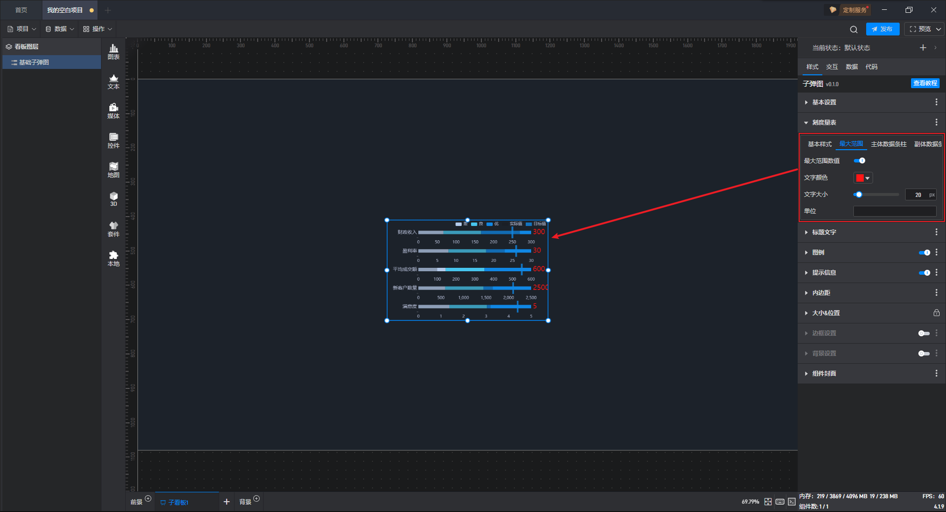 在此处可设置子弹图刻度量表的范围标识、刻度颜色、量表间距和最大单位数值,还可以单独设置组件主体数据条柱、刻度数值、主要标记标识的样式。