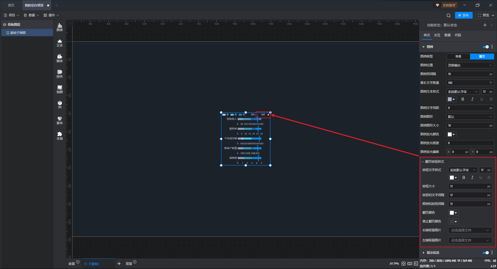 当勾选了多个 Y 轴字段,图例就可以以“翻页”的类型来展示,点击“翻页按钮样式”对翻页按钮单独进行配置。