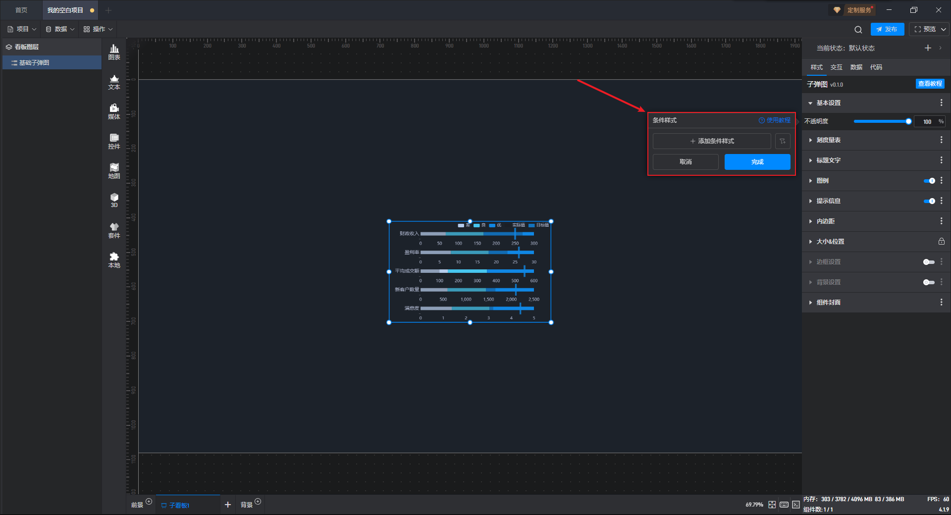 有一些设置项的条件设置方式会直接显示在设置项中,可以直接进行设置,例如比较常用的一个设置就是根据数据条件来改变组件的颜色,但基础子弹图组件目前未提供直接在设置项中设置条件样式的方法。