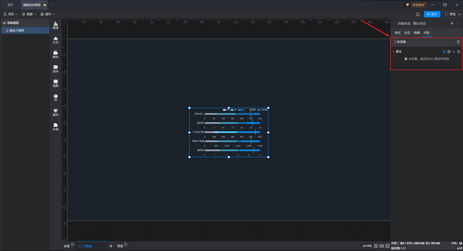 点击选中组件,在右侧设置窗口中切换到“代码”,可以对组件进行二次开发设置。