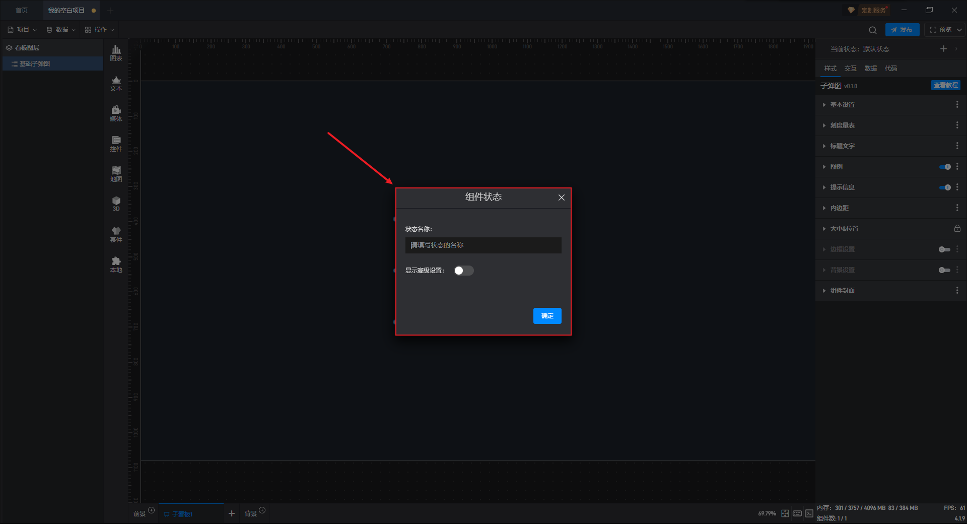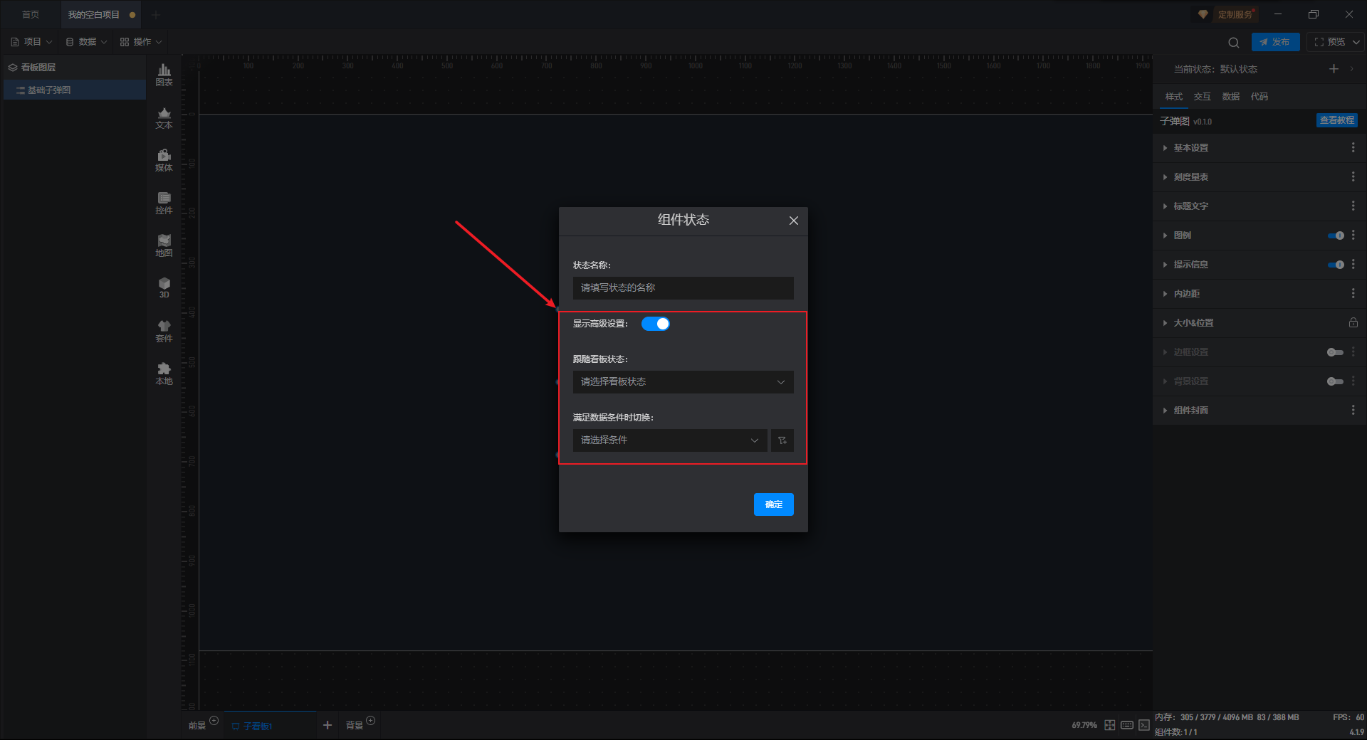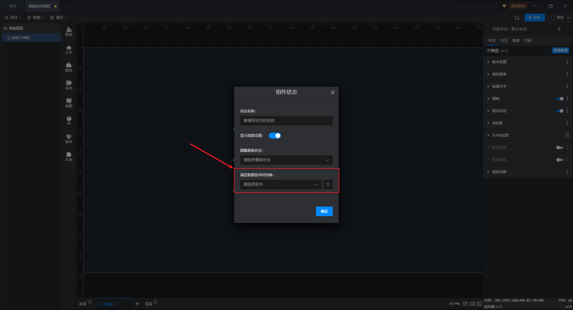 多状态主要用于通过数据条件或是点击交互(通常是点击其他组件来触发本组件的状态切换)来切换组件设置项的场景,这里的设置项包括组件的样式、交互、数据和代码。