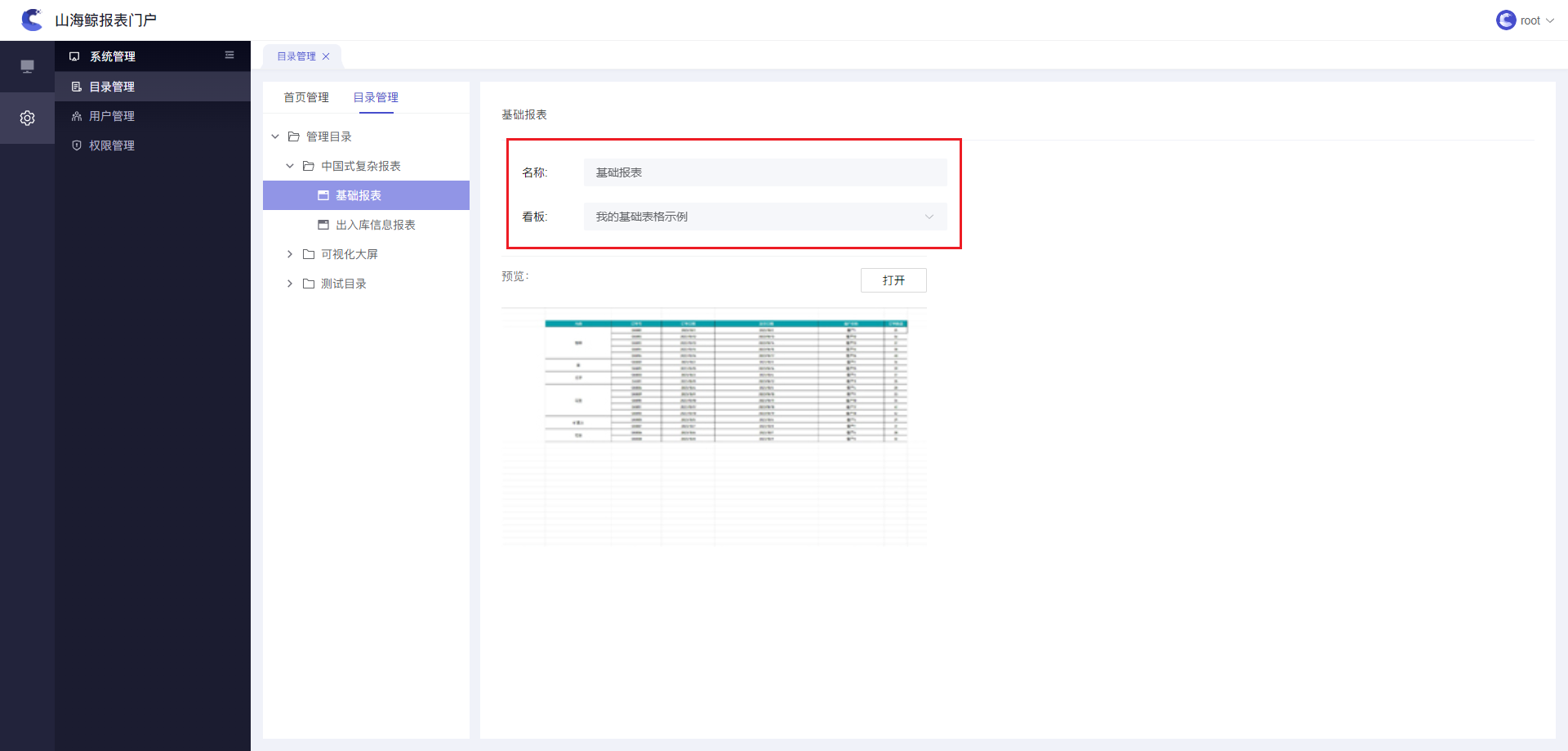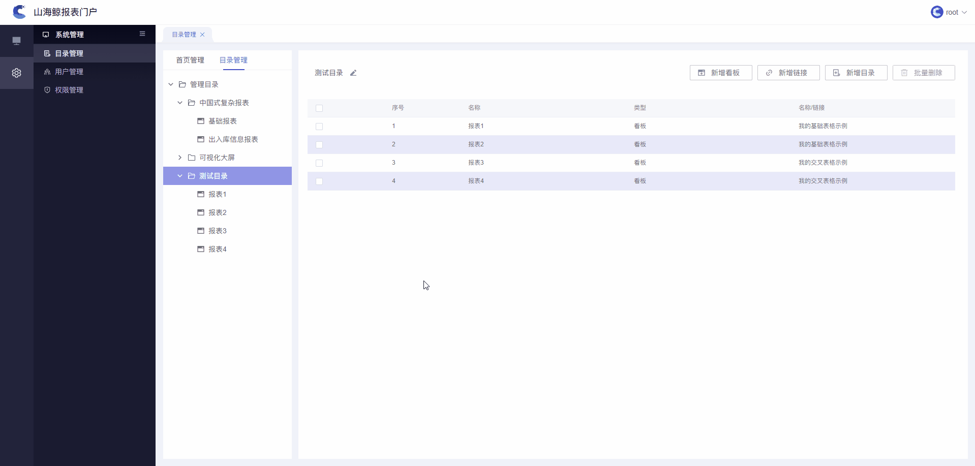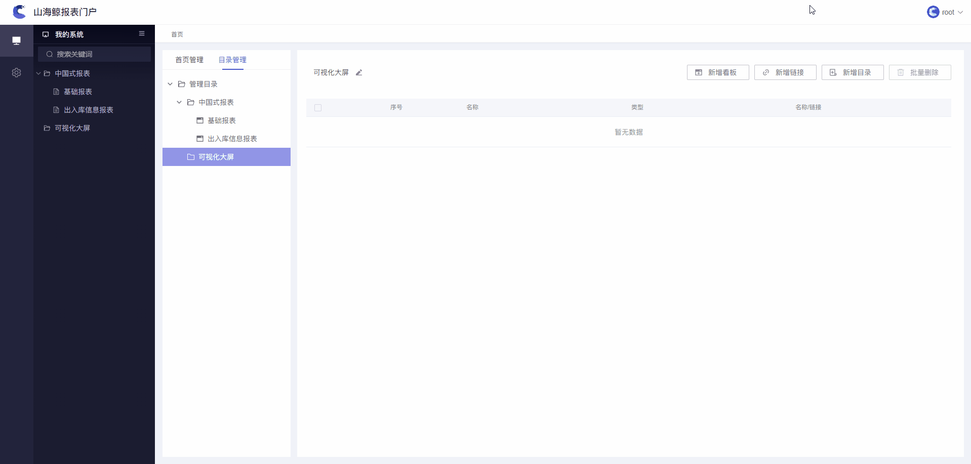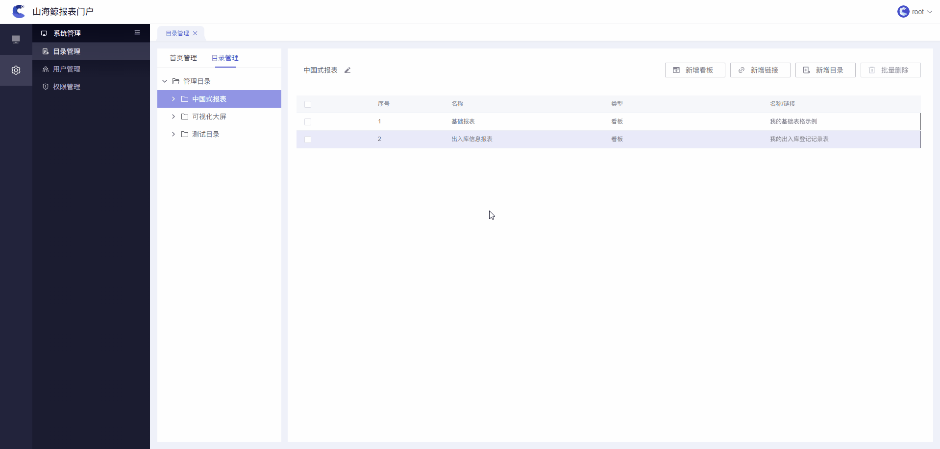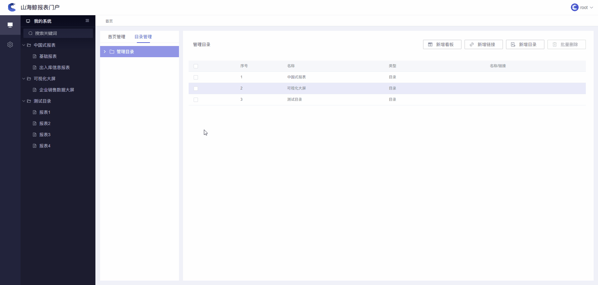 在报表门户系统中,可以对所有的目录进行管理,实现添加、删除、重命名目录等操作,还可以通过关键词查找需要的报表模板。