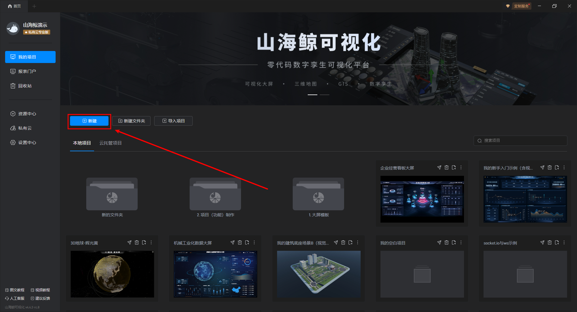 打开山海鲸可视化,点击左上方的“新建”按钮创建一个新项目。