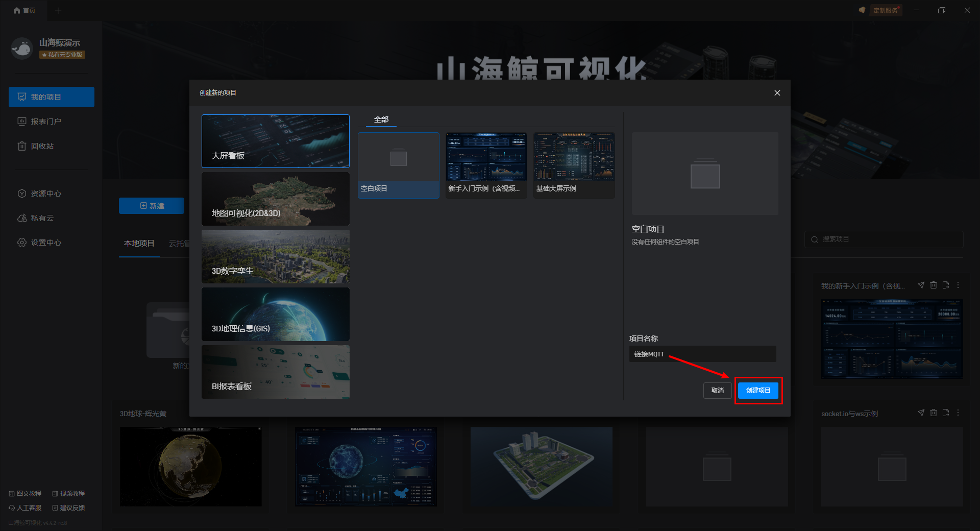 选择“空白项目”,再输入项目名称,最后点击“创建项目”按钮。