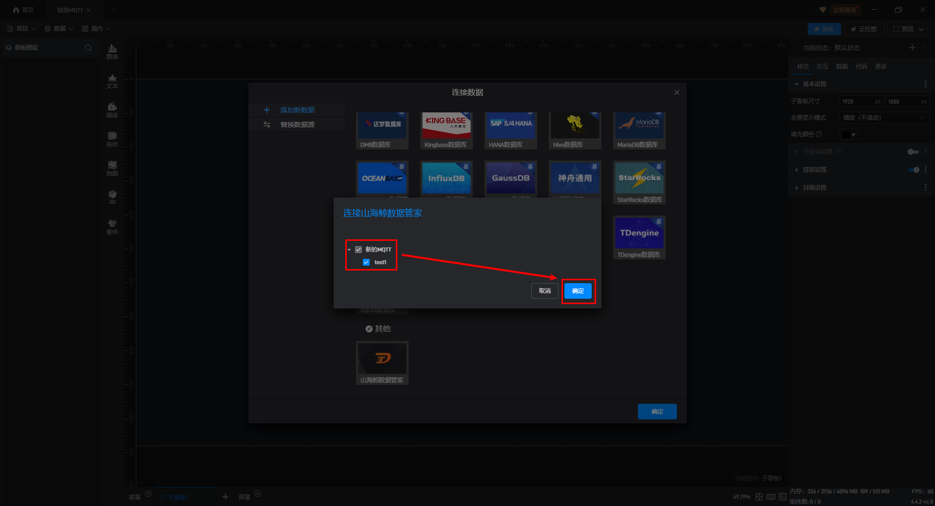 软件会自动加载选中的数据库表中的数据并展示在界面中,确认没问题后点击右下角的“确定”按钮,这样就成功在山海鲸可视化中连接了 MQTT。