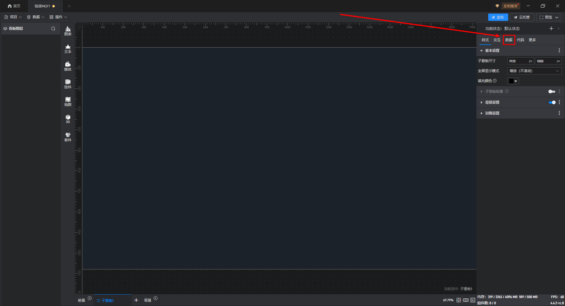 项目创建成功后会被自动打开,点击左上方的“数据”,选择“添加数据”,如下图所示:
