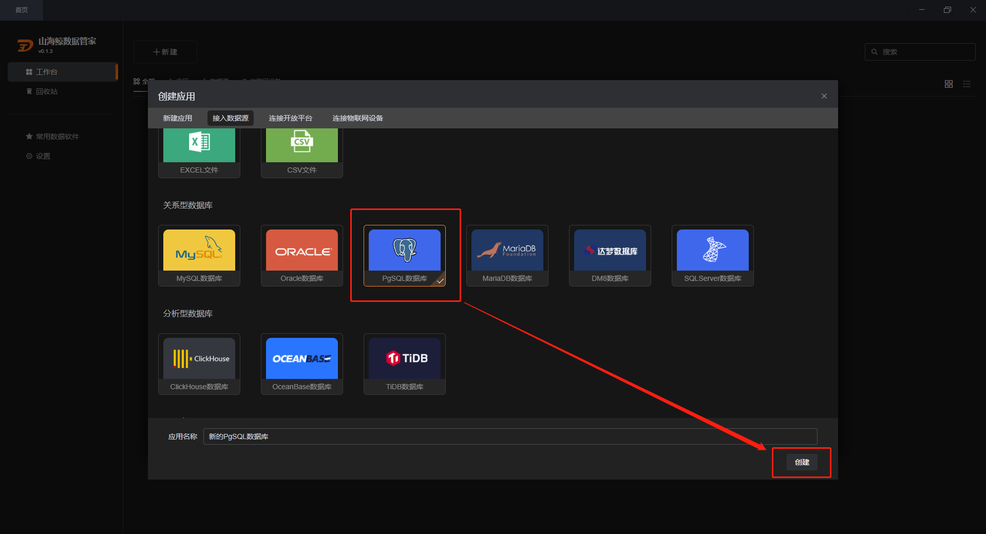 在“接入数据源”弹窗中选择“PgSQL 数据库”,在弹窗最下方的输入框中修改“应用名称”,点击“创建”。