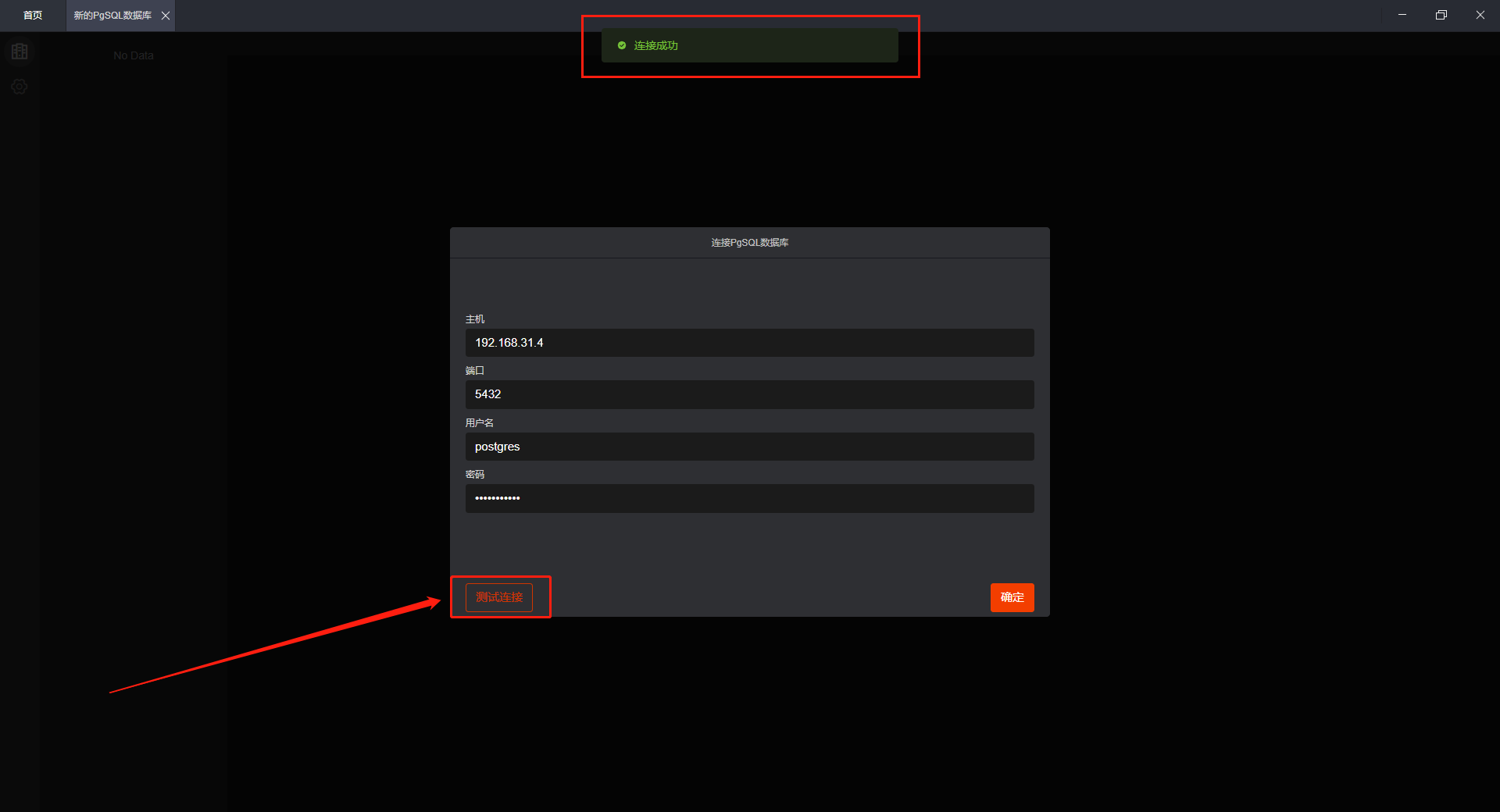 在“连接 PgSQL 数据库”弹窗下方有一个“测试连接”按钮,可以用来测试我们填入的参数信息能否成功连接到数据库。数据库连接测试成功后,点击“确定”。如果测试失败,请检查参数信息是否填写正确,并重复测试连接操作。