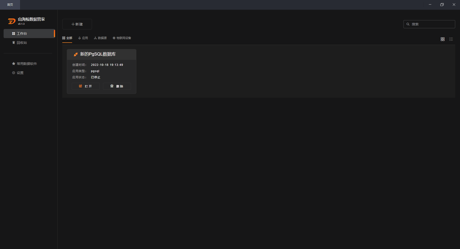 在山海鲸数据管家首页,可以看到刚创建的 MySQL 数据库应用,支持“打开”和“删除”操作。通过API 应用和Hub 应用可以对数据源进行更复杂的处理。