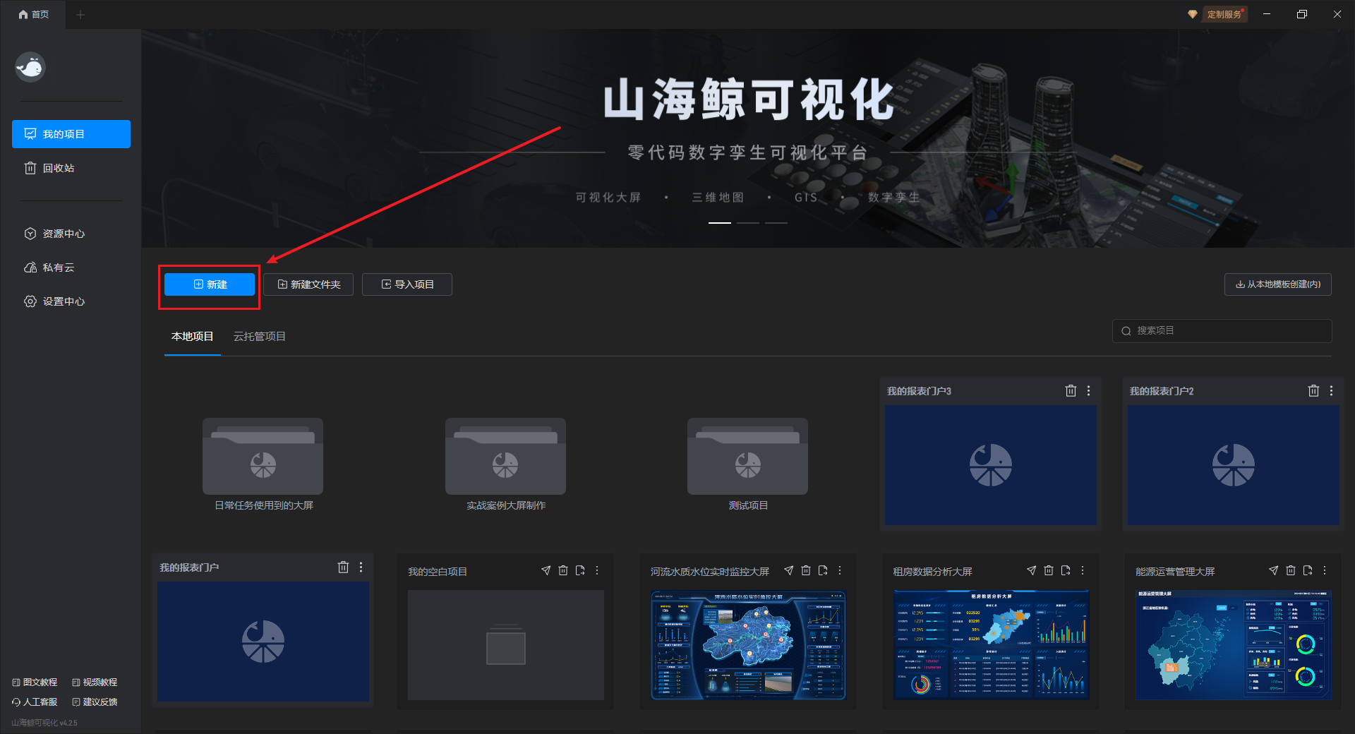 打开山海鲸可视化,点击左上方的“新建”按钮创建一个新项目。