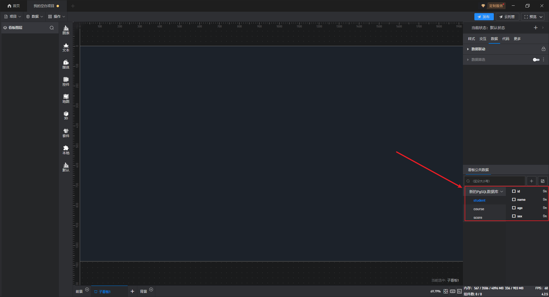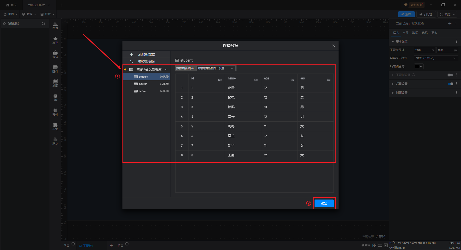 软件会自动加载选中的数据库表中的数据并展示在界面中,确认没问题后点击右下角的“确定”按钮,这样就成功在山海鲸可视化中接入了 PgSQL 数据库。
