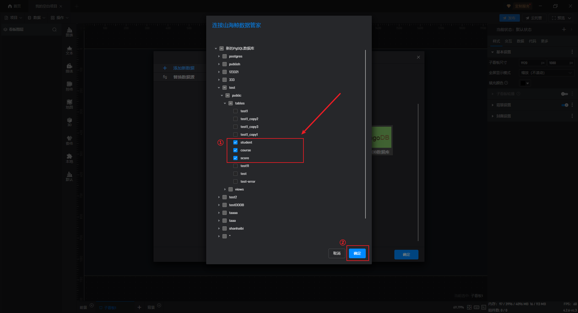 选择需要添加的PgSQL 数据库,选中需要添加的“数据库表”,选择完成后点击右下角的“确定”按钮,如下图所示: