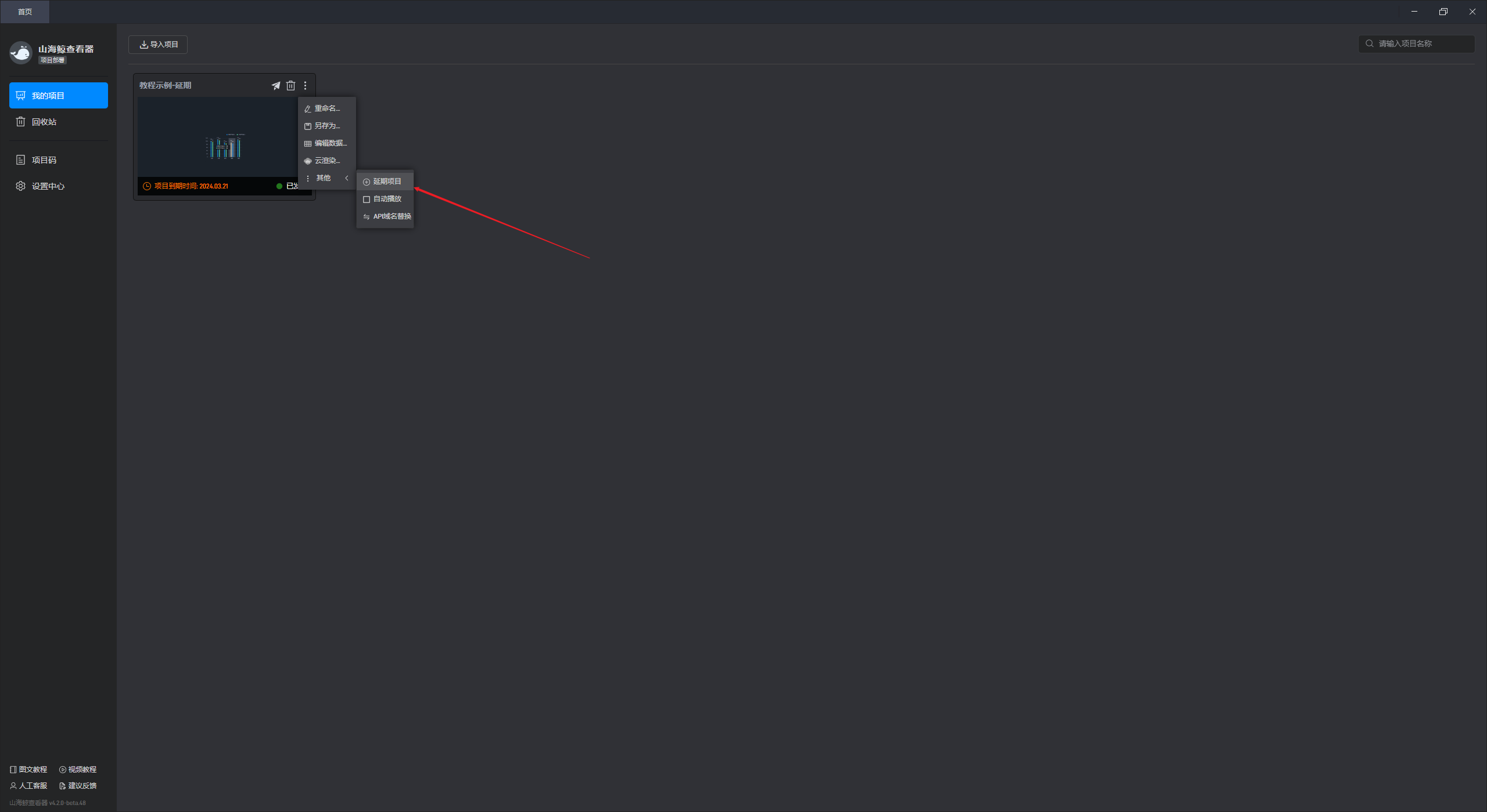 客户接收到延期码文件后,在山海鲸查看器中点击需要延期的项目右上角菜单中的延期项目。