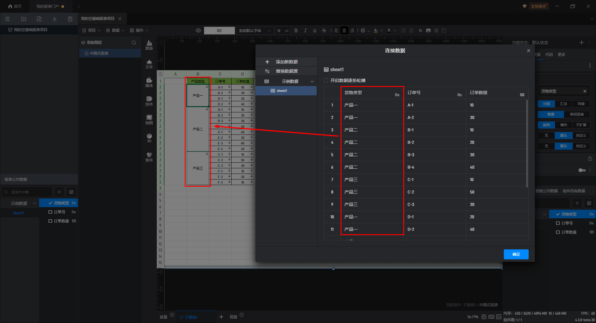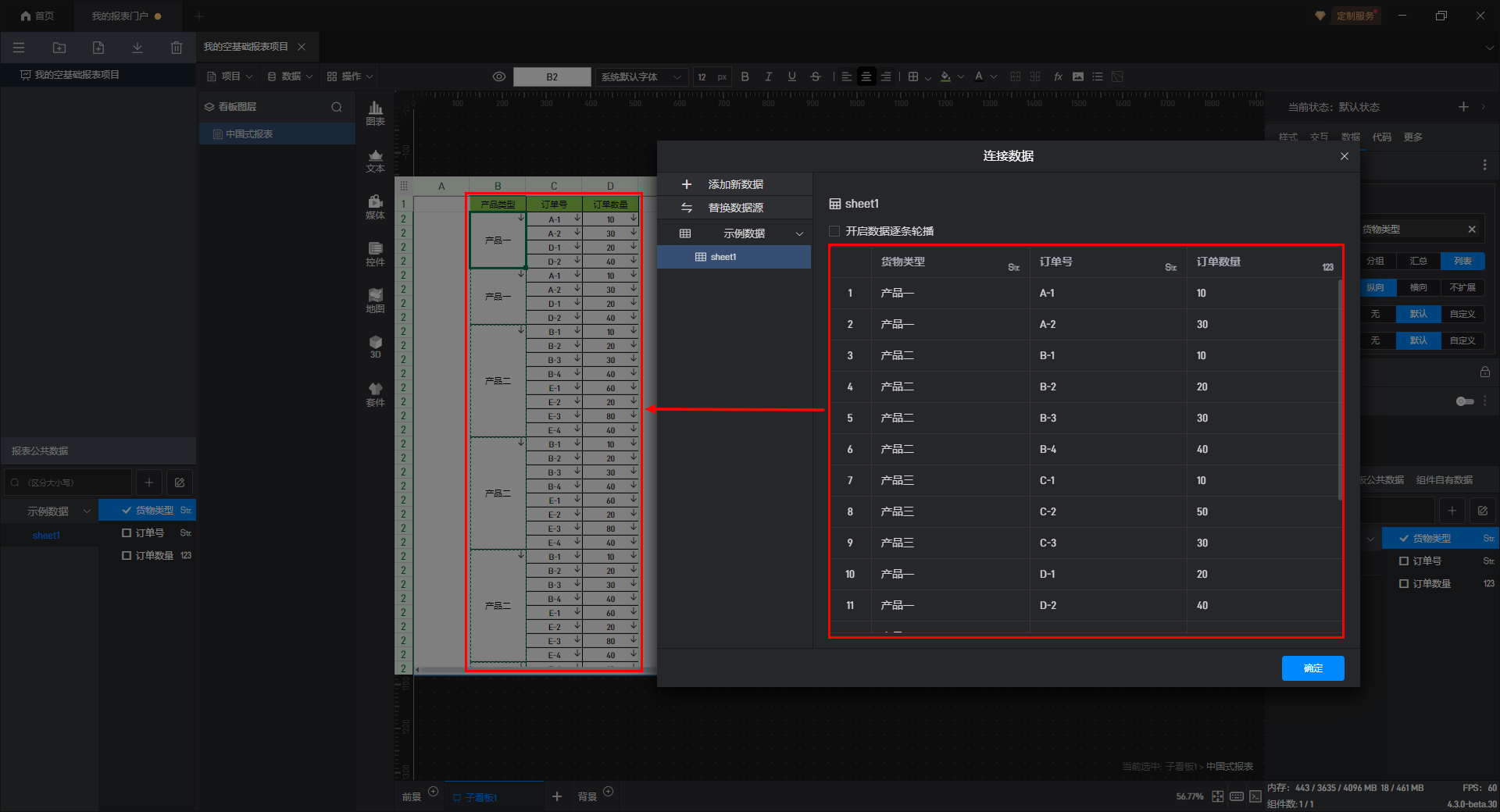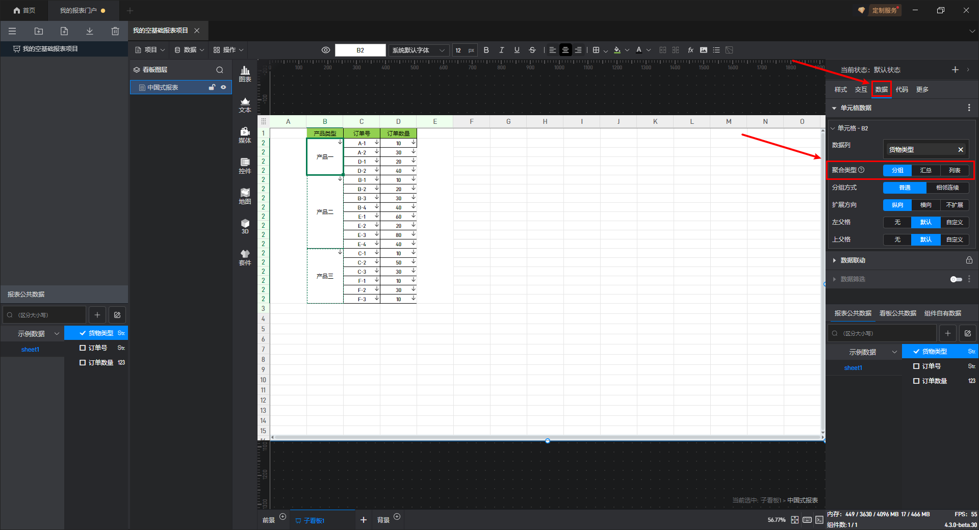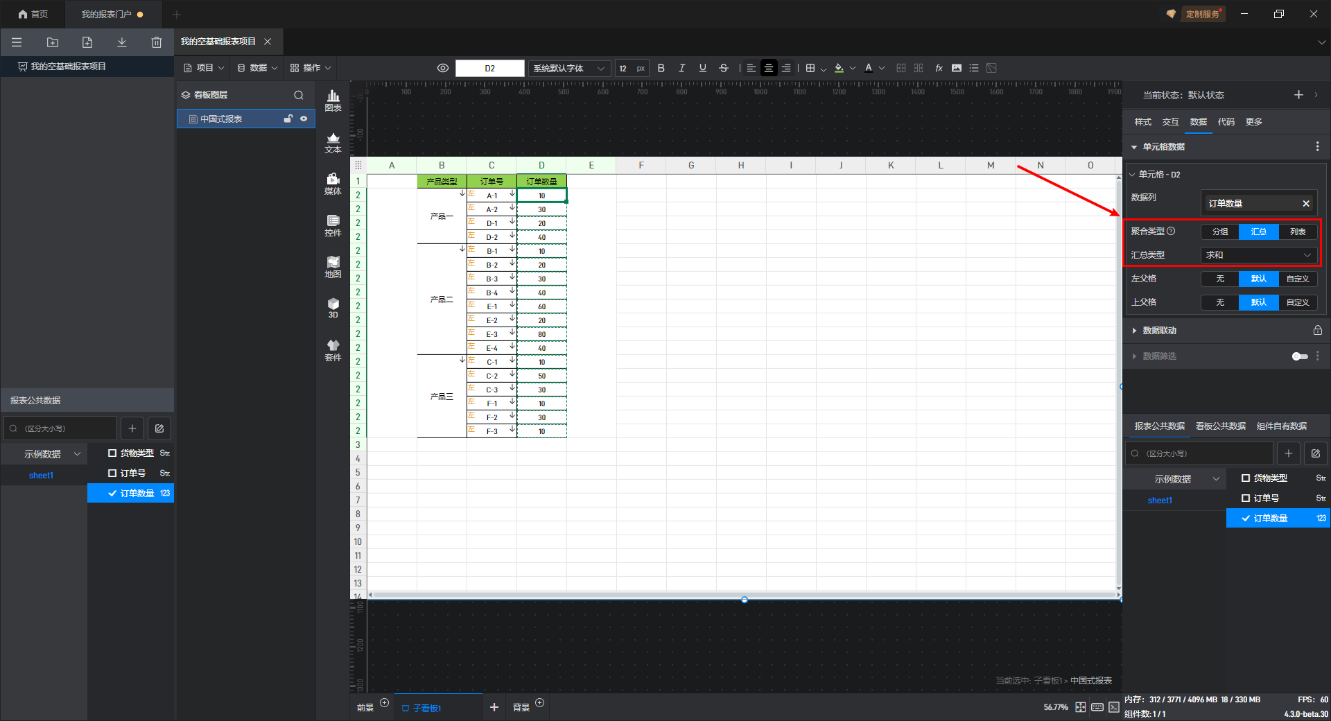 对于表中的数值类型字段,我们可以设置其聚合方式,例如对订单数量字段,根据产品类型与订单号进行汇总求和。
