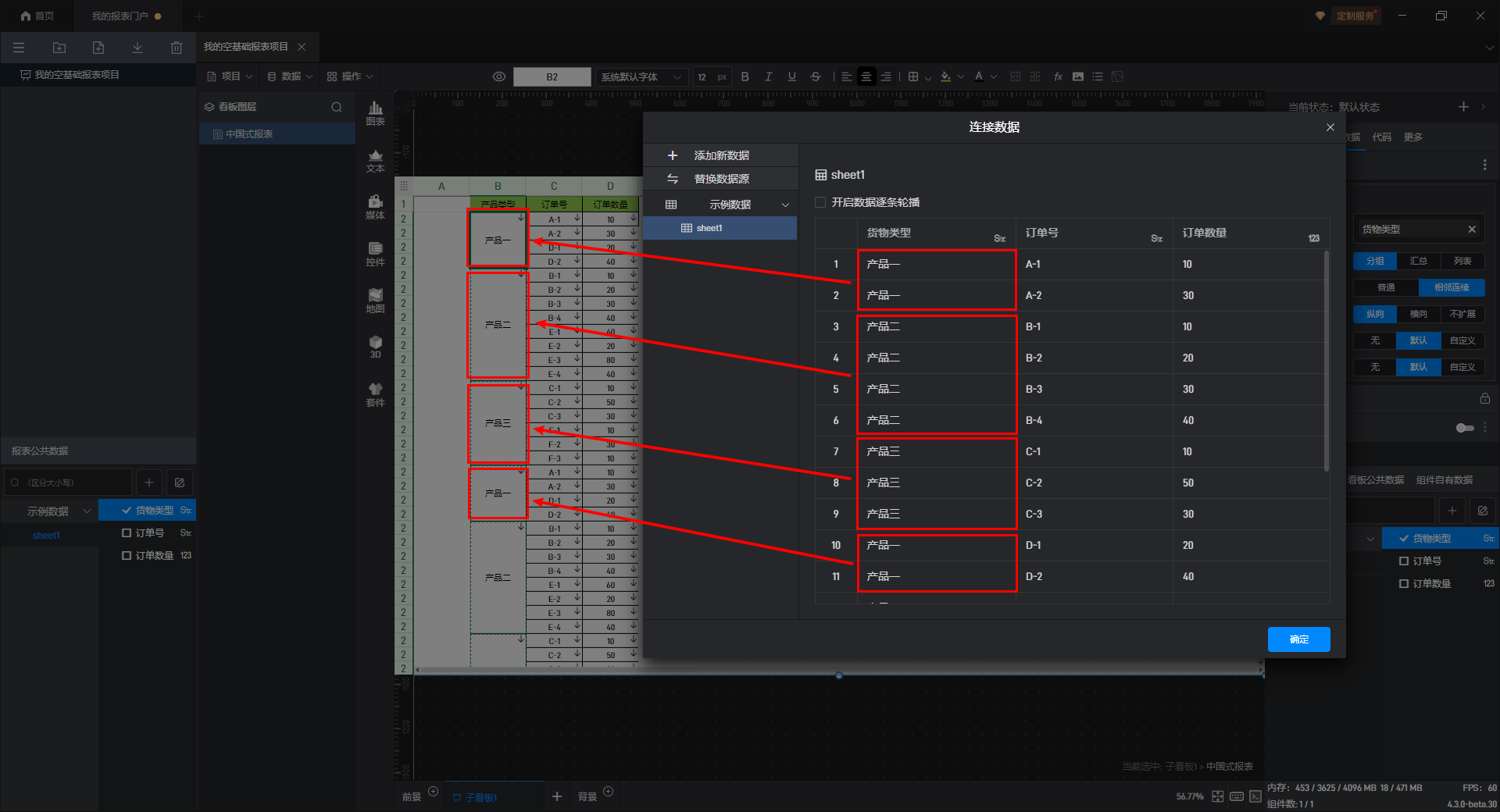 在山海鲸可视化中,报表的效果都是通过对基础数据进行加工而来的。制作一张报表模板,首先应准备报表所需的基础数据。基础数据的来源方式有多种,例如 MySQL、SqlSever 等数据库或 Excel、JSON 等静态数据文件,将添加的数据字段拖拽到报表里,即可实时预览添加的数据。