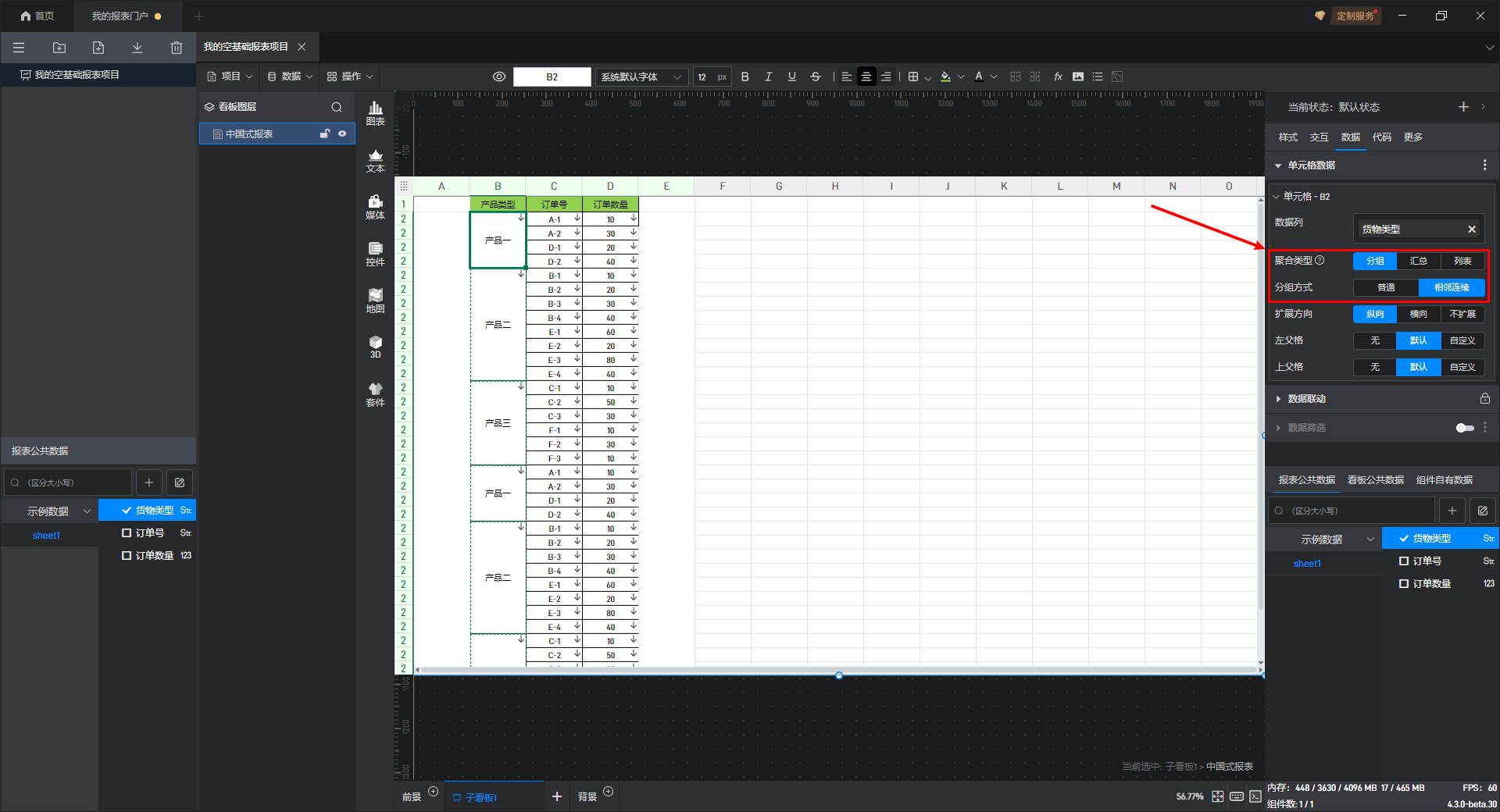 在预览数据时,中国式报表组件会自动合并数据源中的相同项,以分组方式显示。分组方式分为普通分组和相邻连续分组,下面我们对比二者不同的使用情景。