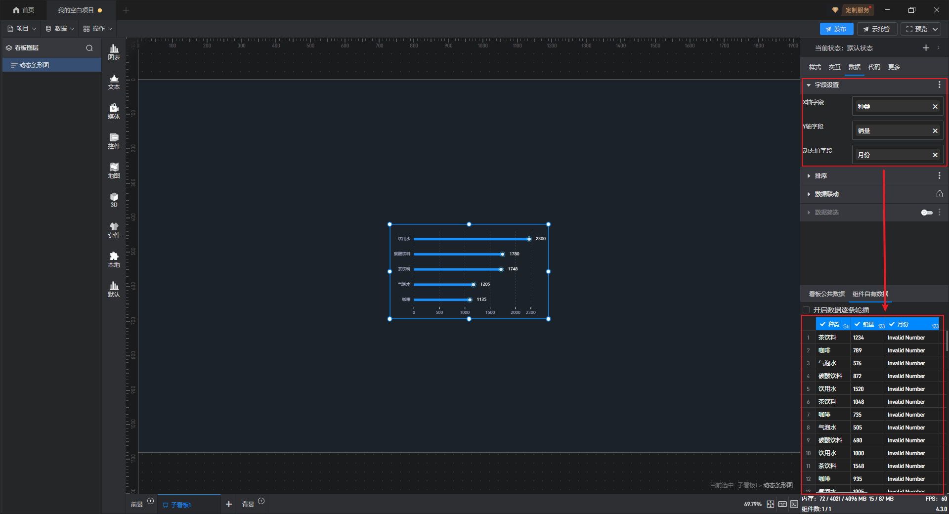 其中 X 轴字段是字符串类型,Y 轴字段和动态值字段是数字类型。