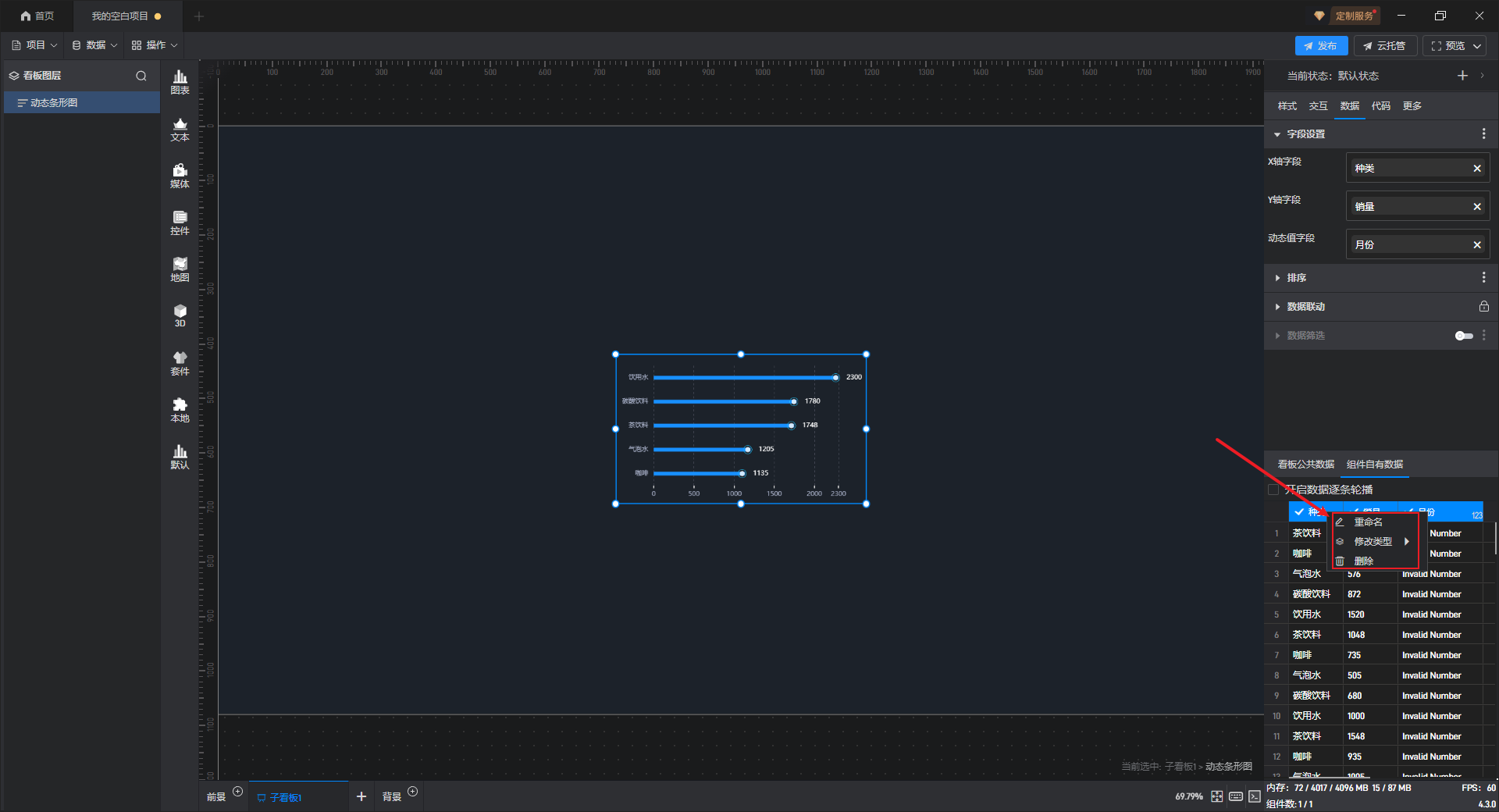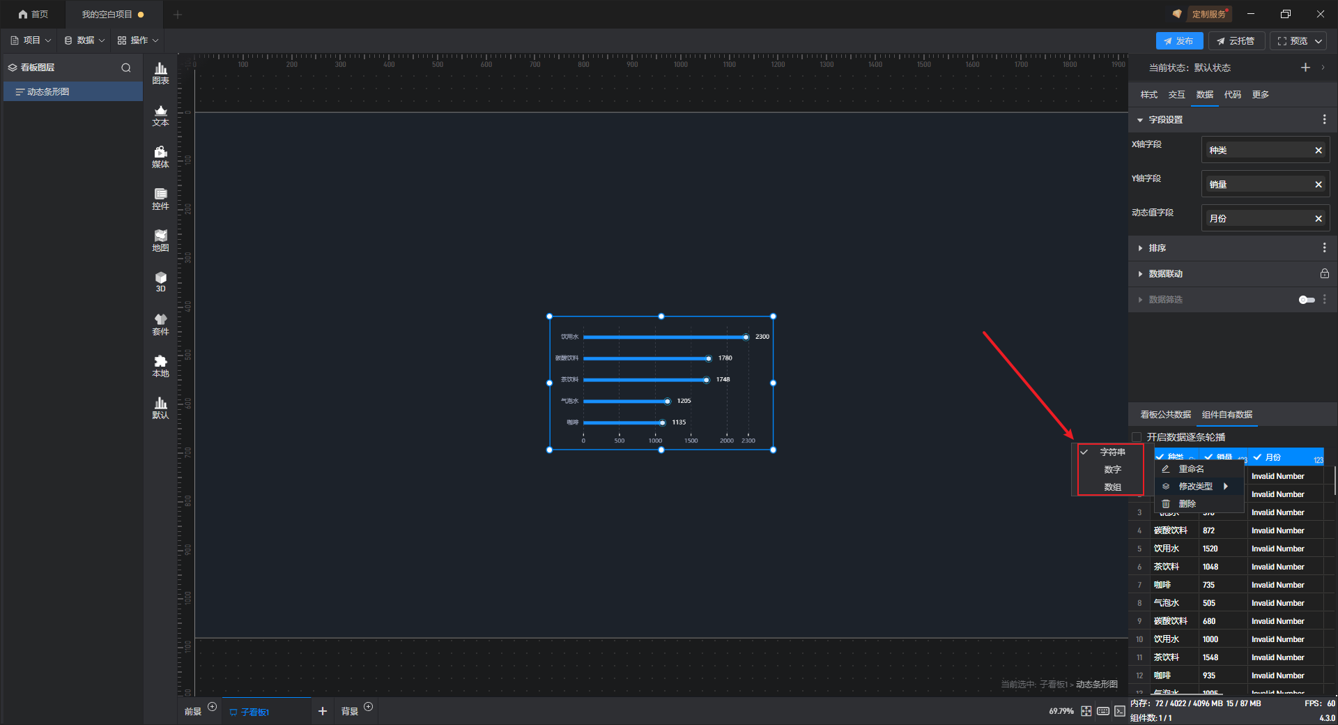 字段类型包括:字符串、数字和数组(X 轴字段是字符串类型,Y 轴字段和动态值字段是数字类型,数组类型用于词云组件),只有在字段类型正确的情况下,组件内容才能正常显示。