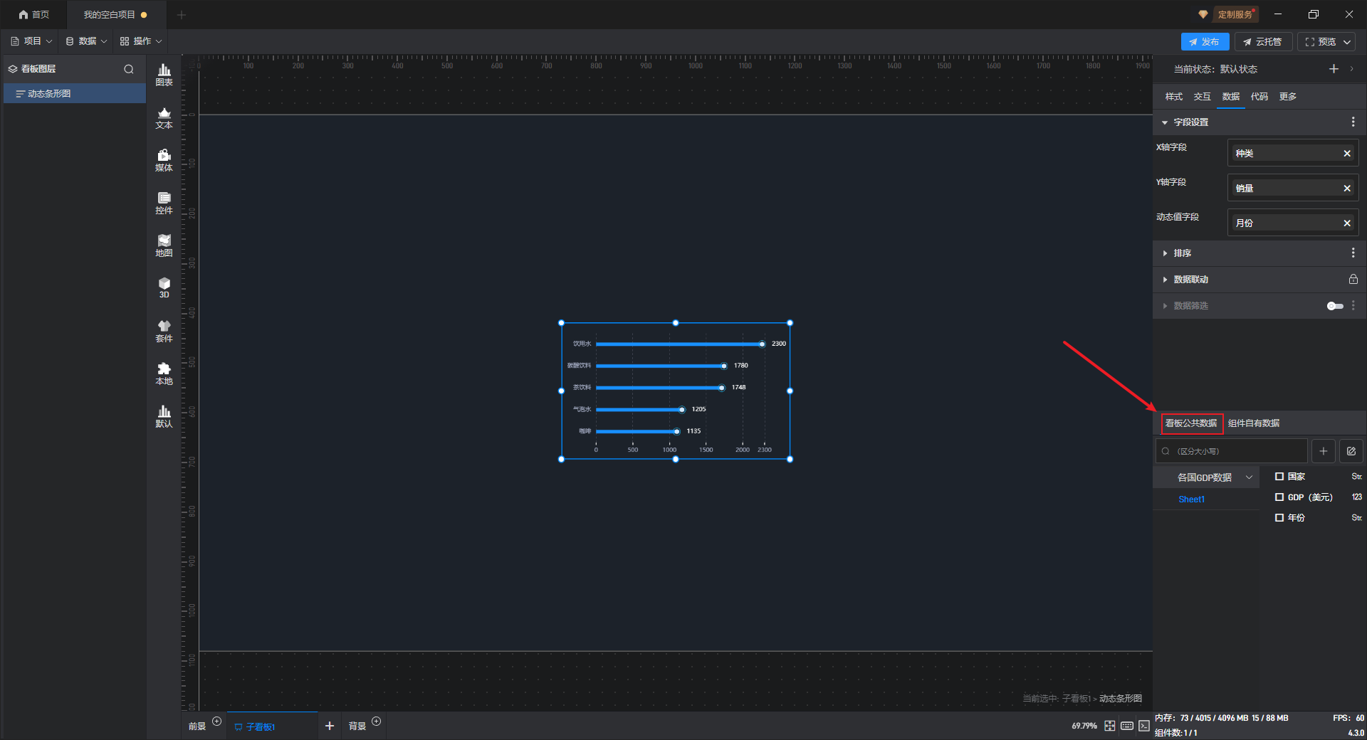 点击选中组件,在右侧“数据”设置窗口中切换到“看板公共数据”(同一个项目中所有数据源是共享的)。