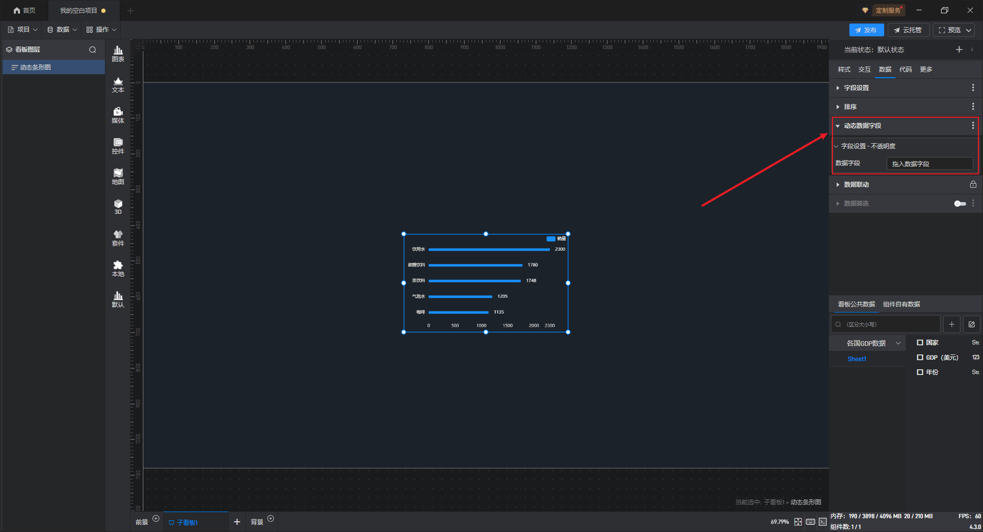 切换到“数据”设置界面,此时可以看到界面中新添加了一个“动态数据字段”的设置项,并且针对刚才选择的“不透明度”设置项生成了一个关联的字段。