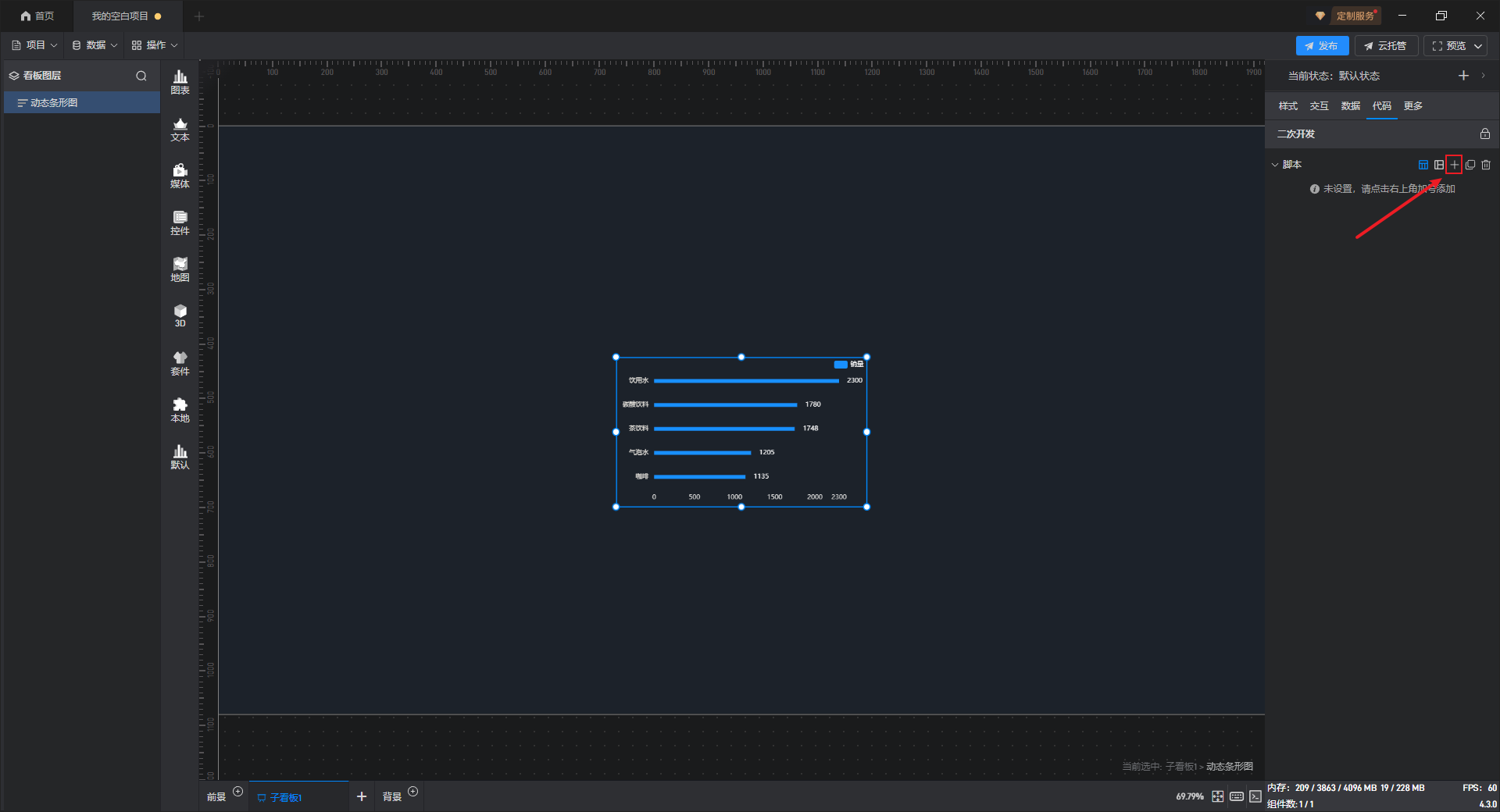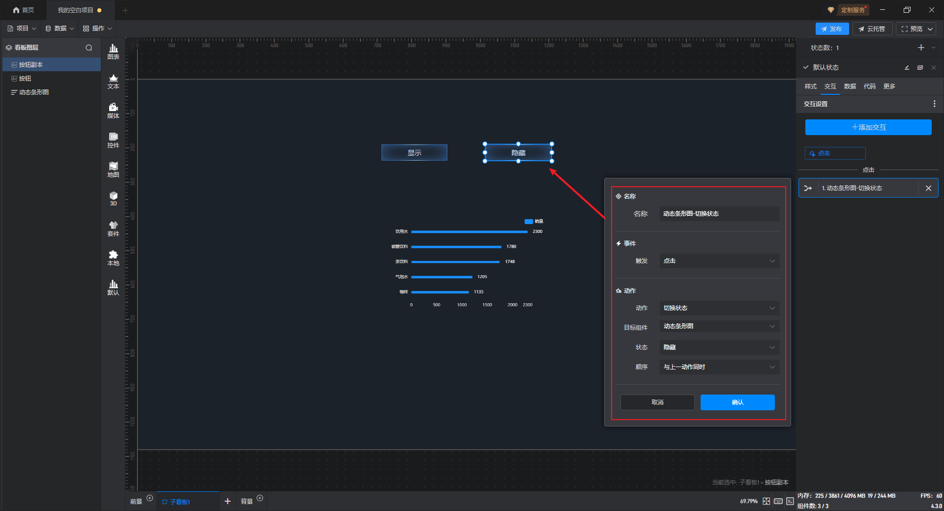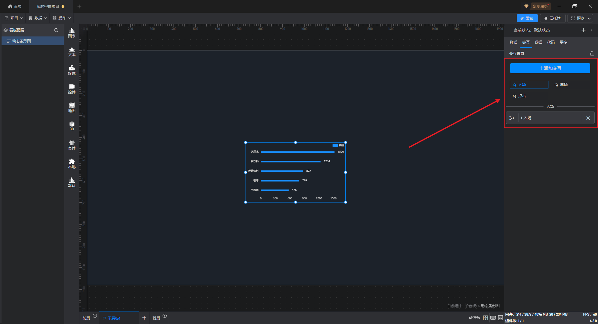 所有组件在添加后都有两个预设交互,对应的分别是入场动画和离场动画,这两个交互建议大家不要删除。动态条形图还预设了一个点击交互,点击动态条形图组件即可播放动画。
