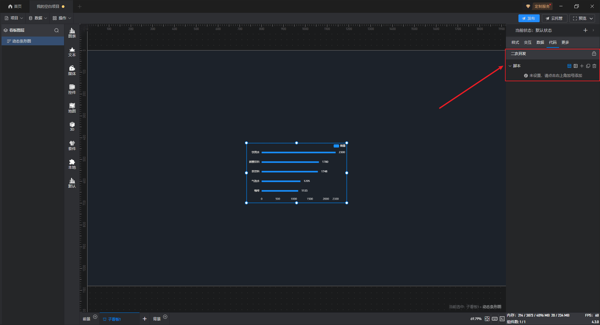 点击选中组件,在右侧“代码”设置窗口中可以对组件进行二次开发设置。
