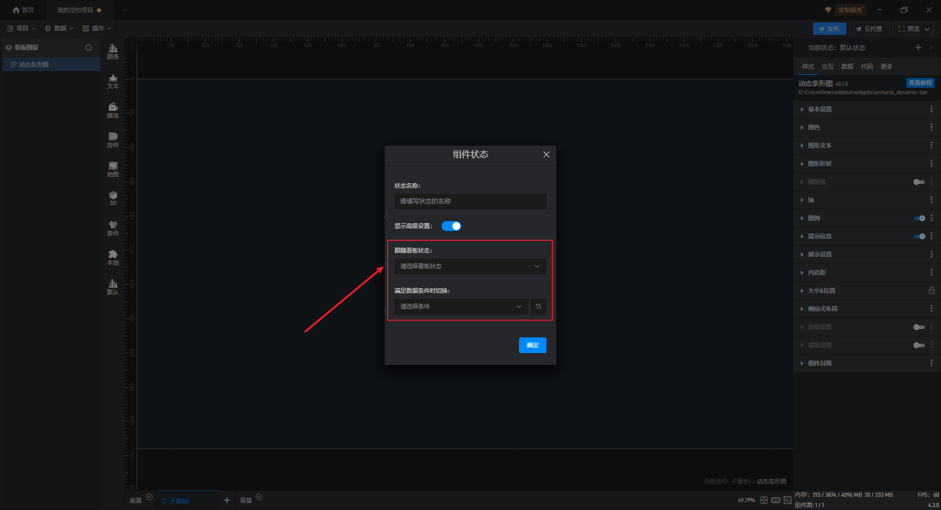 多状态主要用于通过数据条件或是点击交互(通常是点击其他组件来触发本组件的状态切换)来切换组件设置项的场景,这里的设置项包括组件的样式、交互、数据和代码。