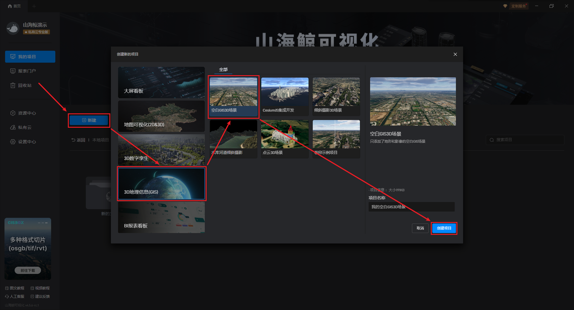 在山海鲸可视化软件“我的项目”中点击“+新建”,选择“3D 地理信息(GIS)”创建一个空白的 GIS3D 场景。