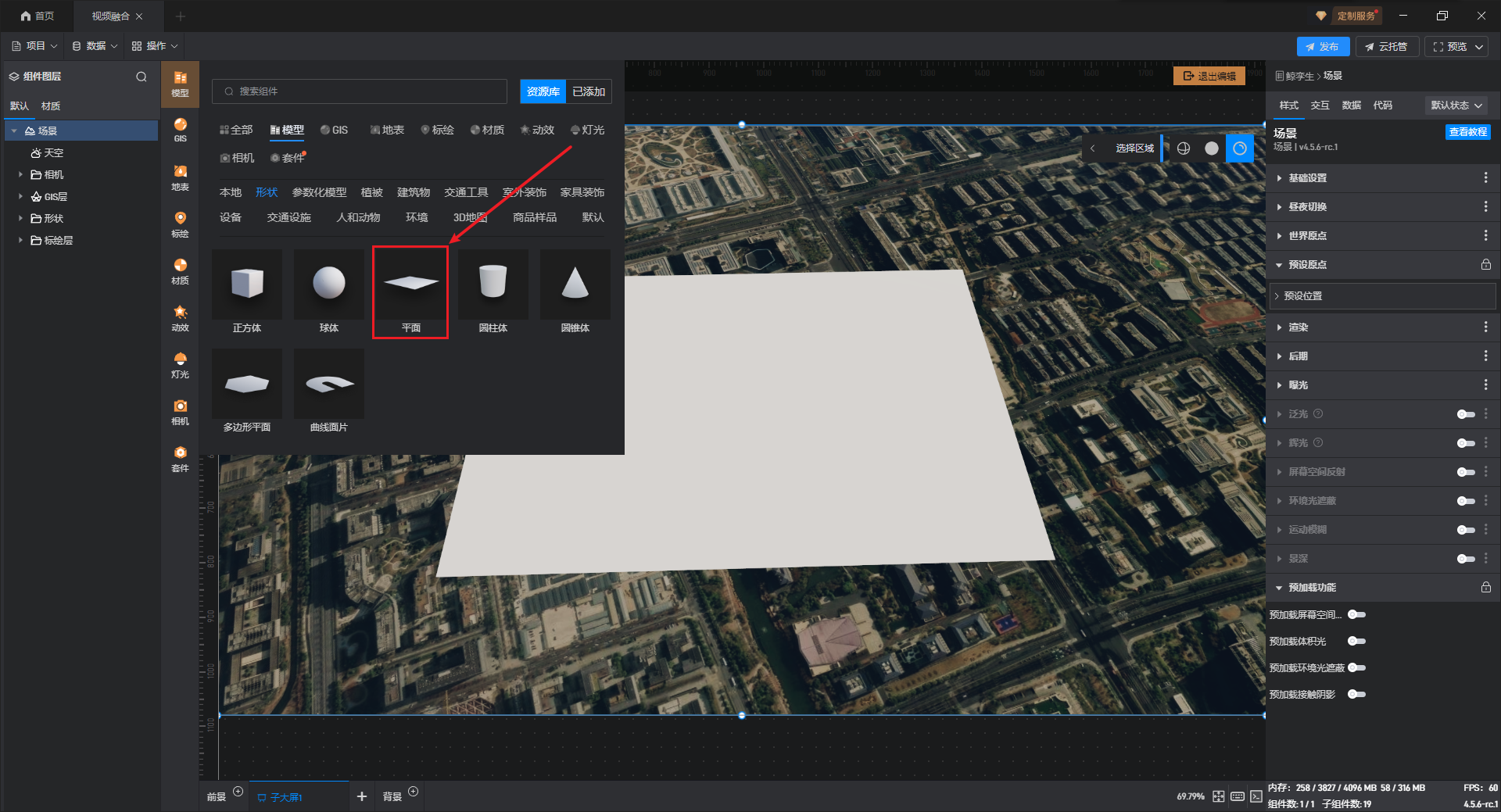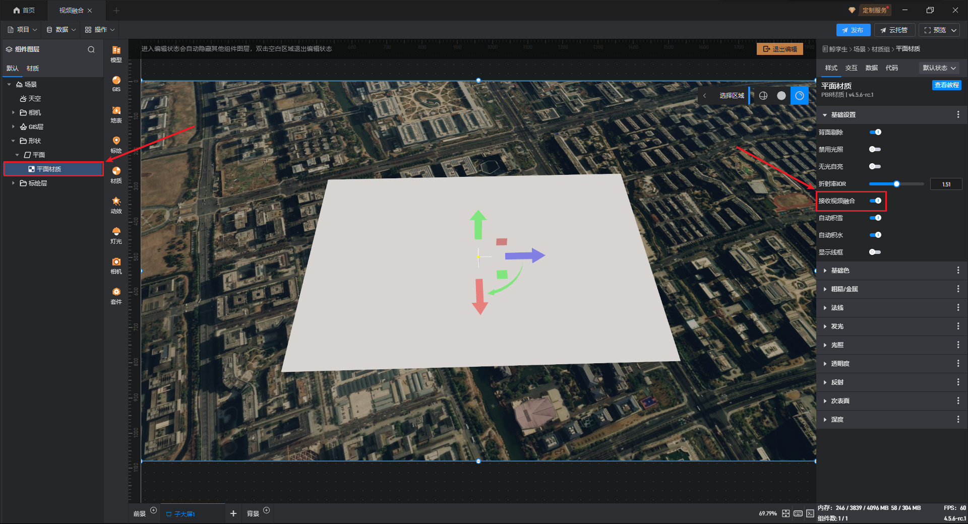 将平面添加至场景的合适位置后,点击“平面材质”,确保该平面接收视频融合。