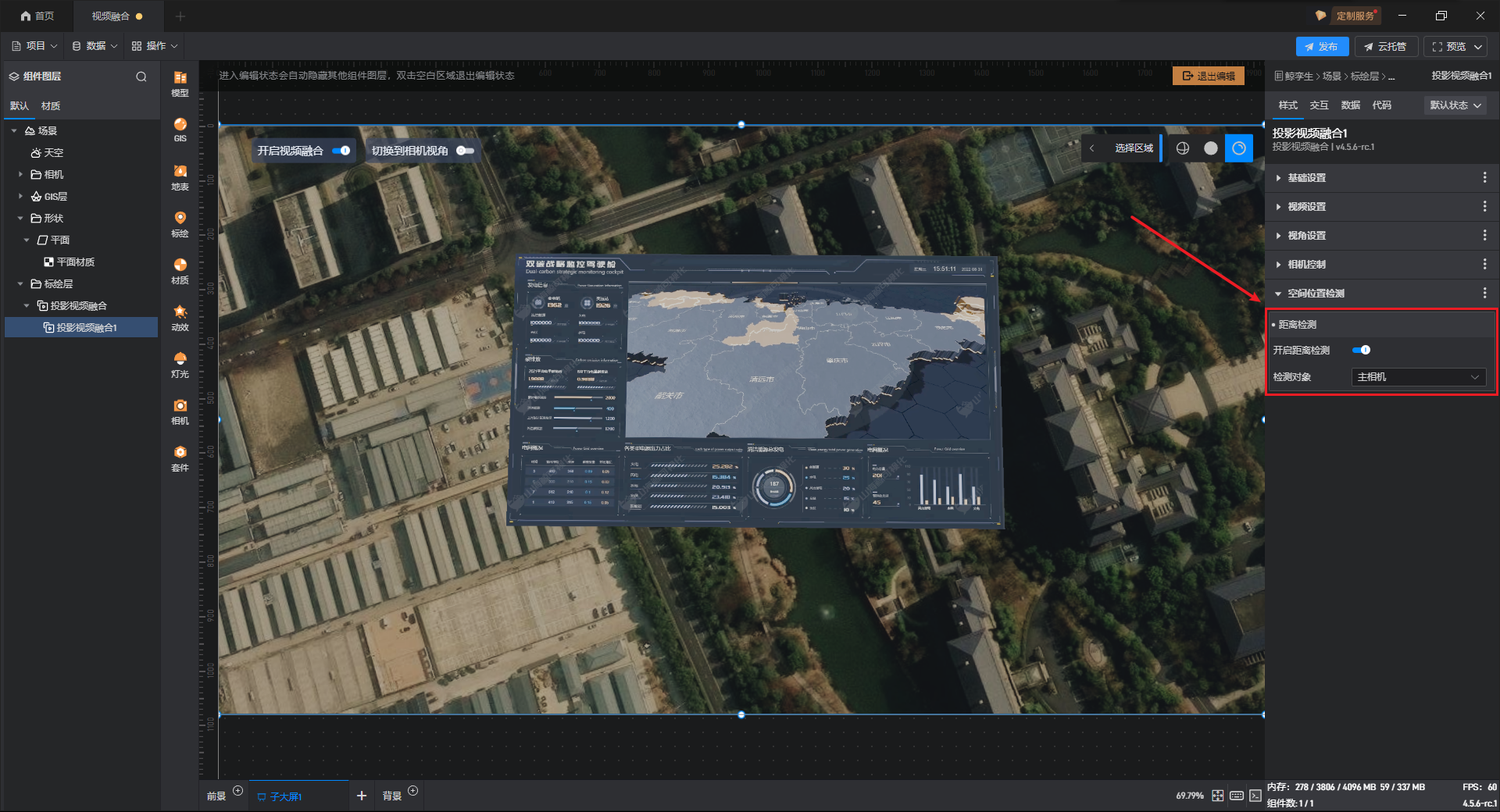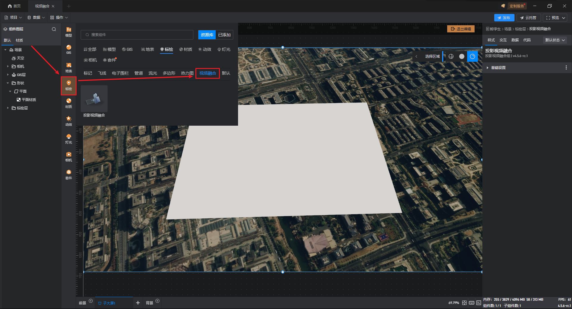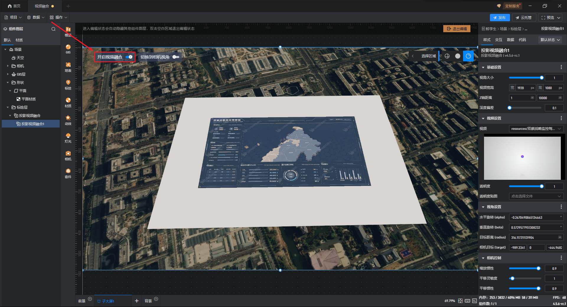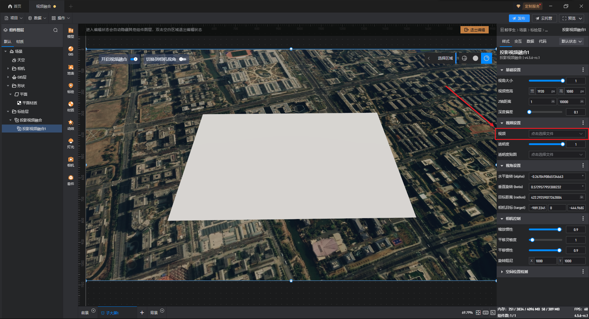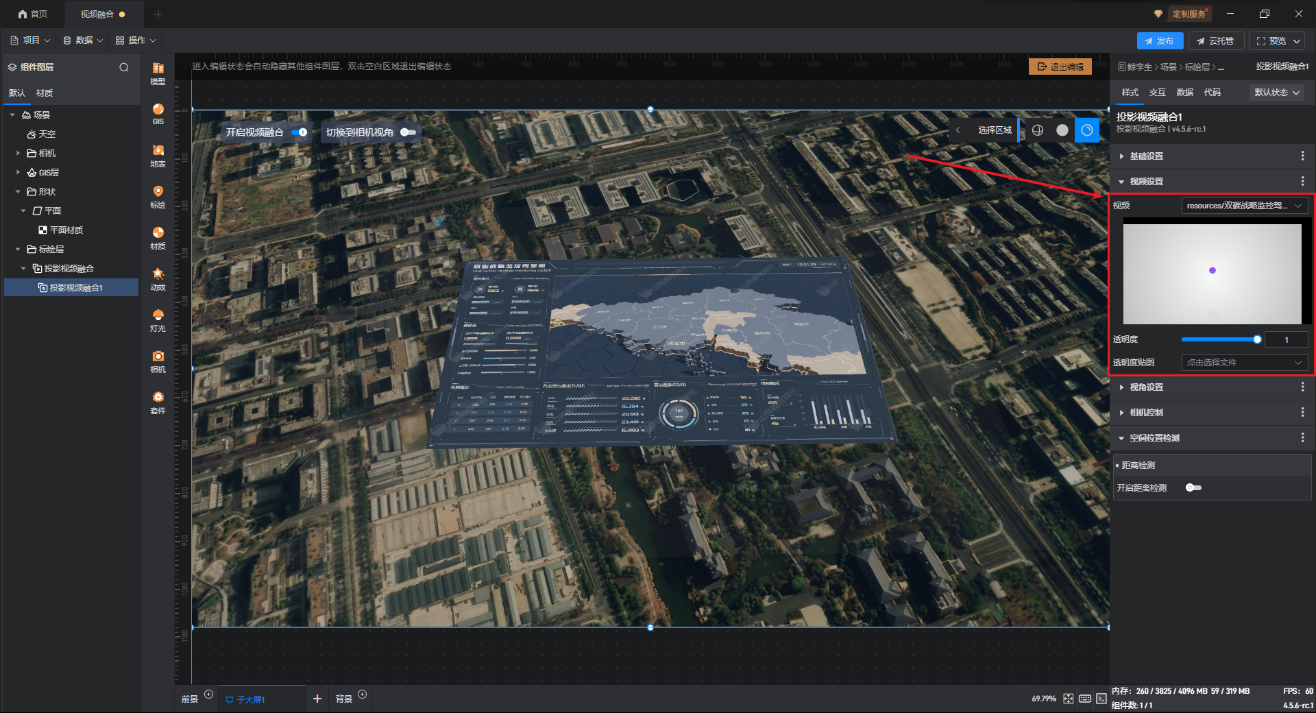 开启视频融合后,将平面模型的不透明度调低,即可实现视频与场景的融合。