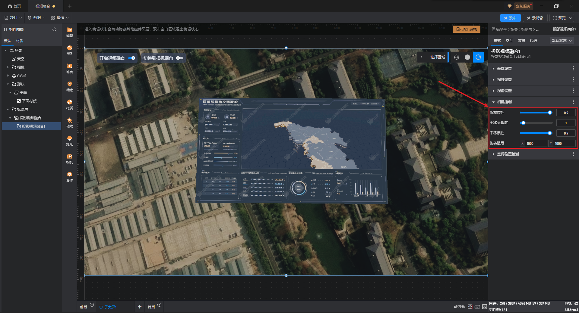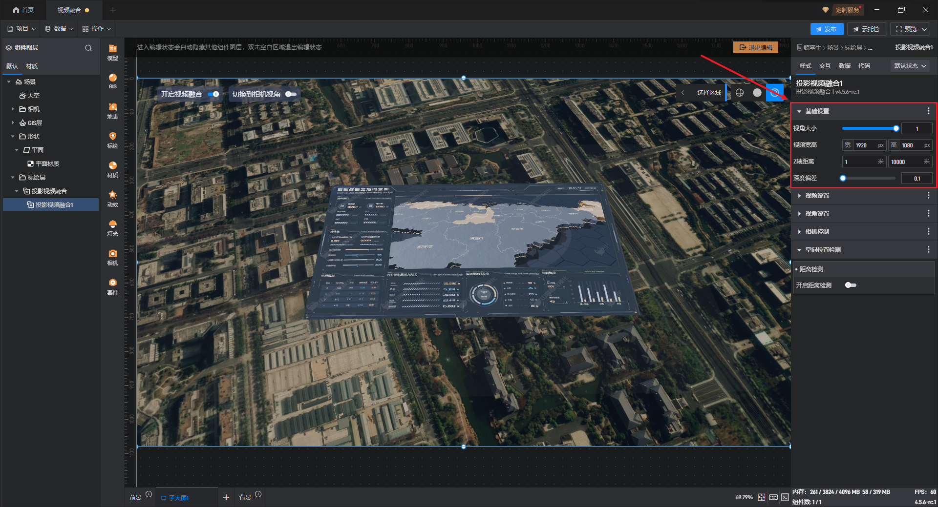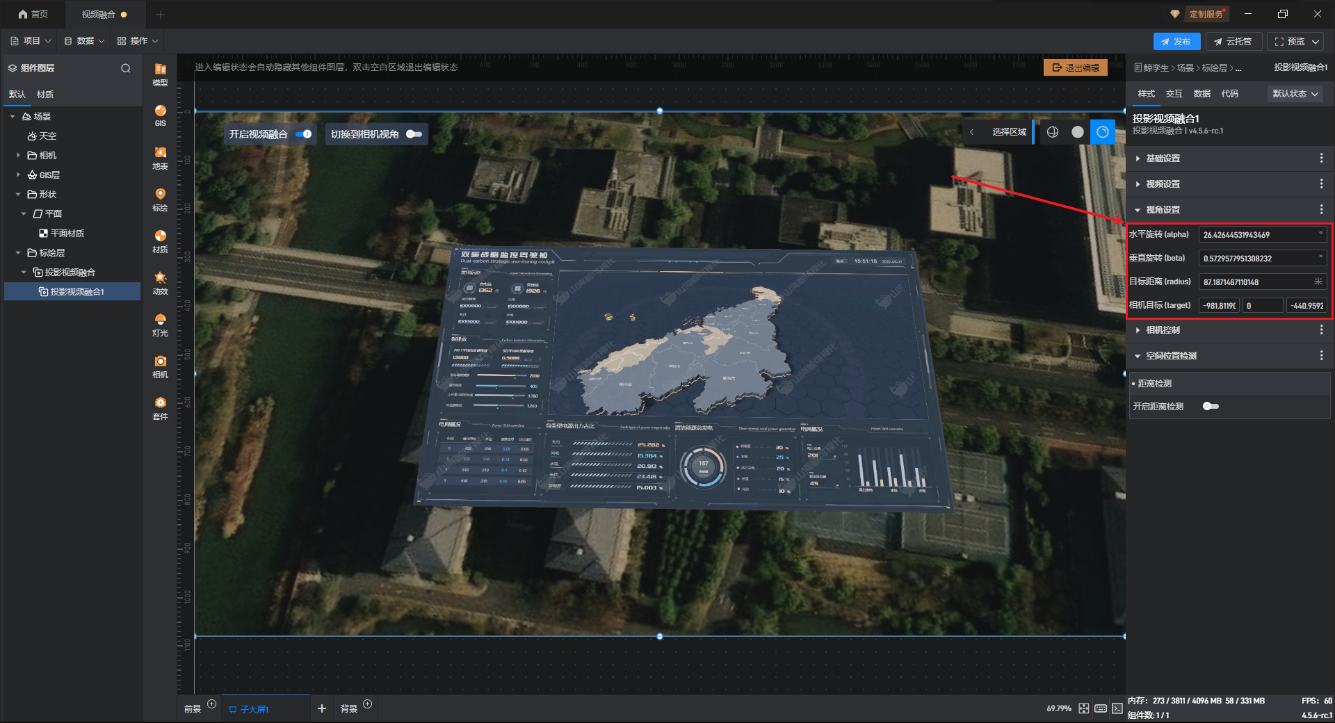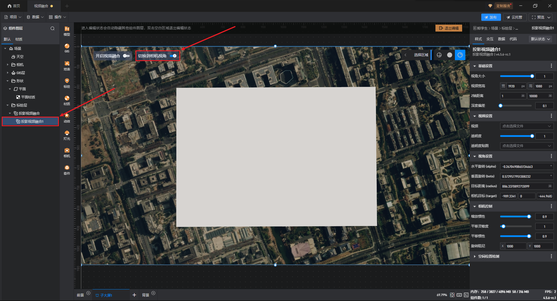 选中视频融合组下的“投影视频融合 1”,打开“切换到相机视角”,将视角调整至投影的位置。