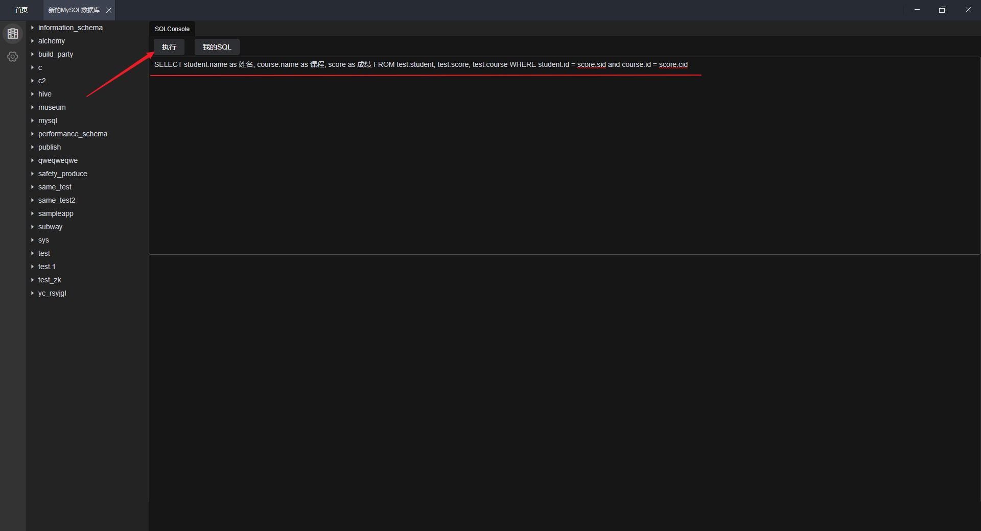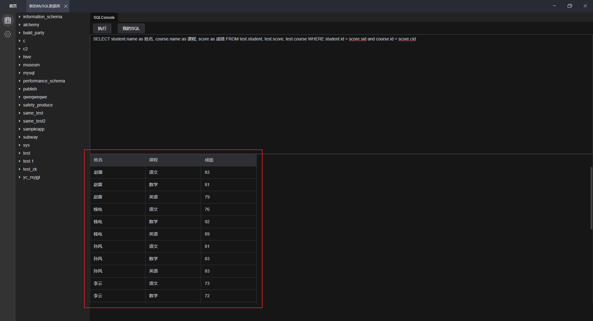 1 | SELECT student.name as 姓名, course.name as 课程, score as 成绩 FROM test.student, test.score, test.course WHERE student.id = score.sid and course.id = score.cid; |
