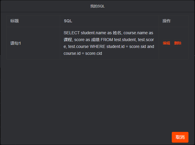 点击“管理”,可以在“我的 SQL”弹窗中查看已添加的 SQL 语句,并对 SQL 语句进行“编辑”和“删除”操作。