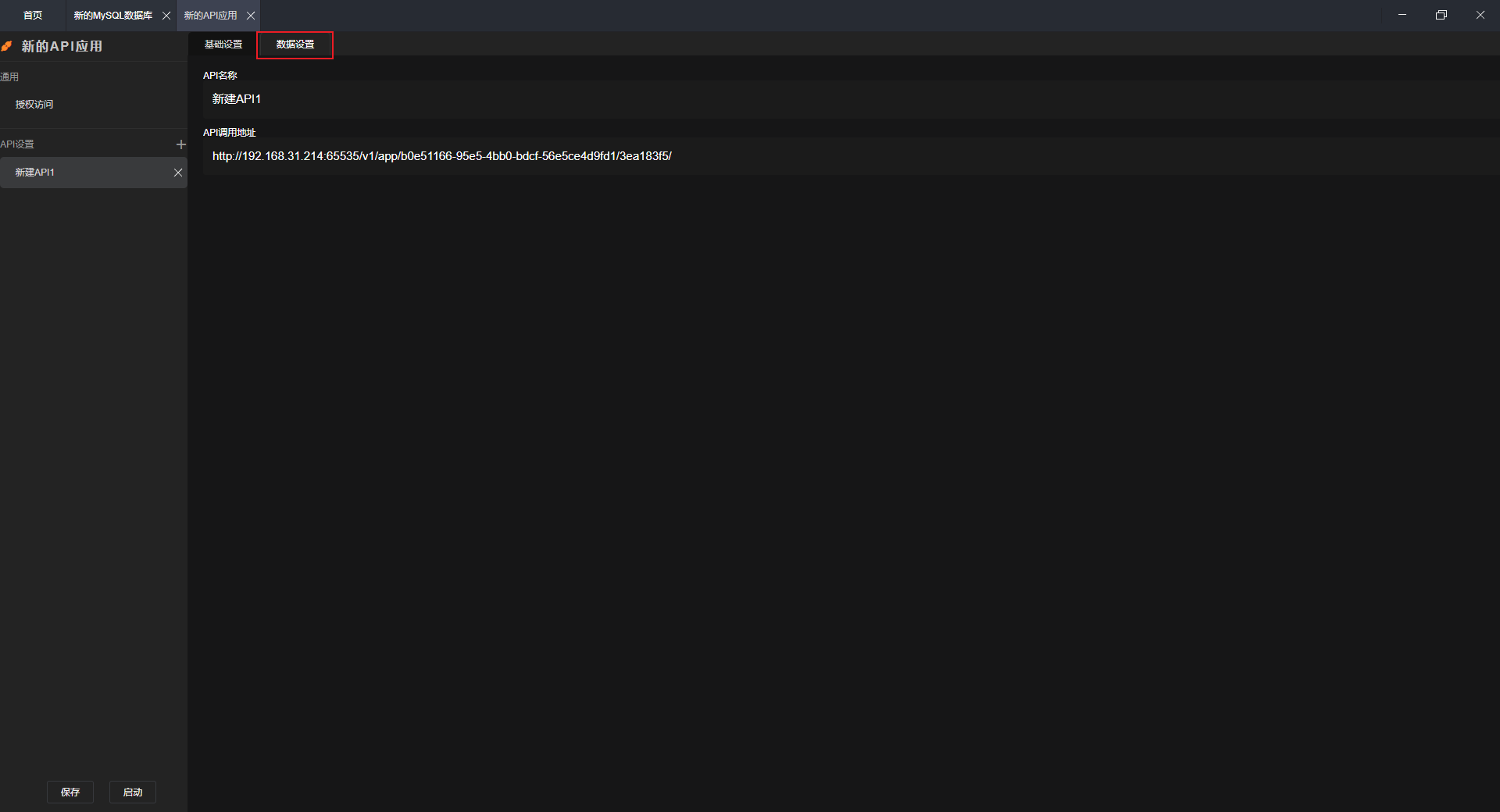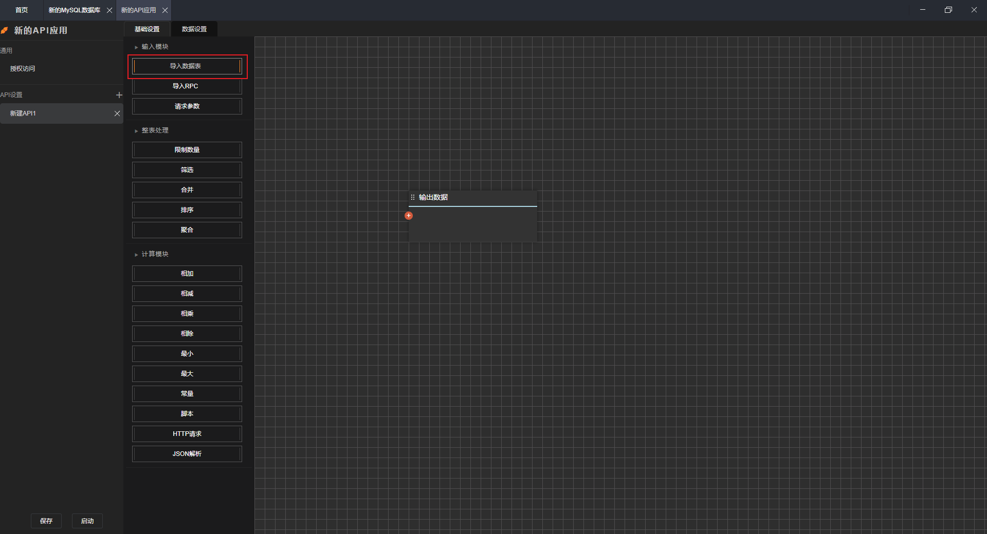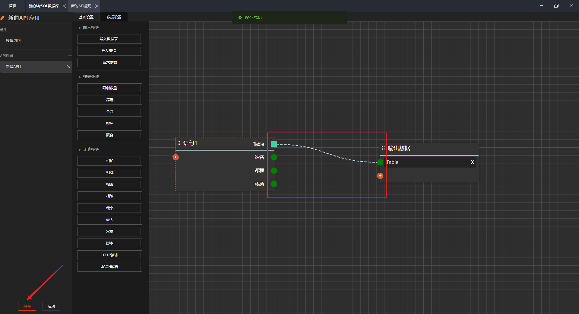数据表导入后,通过鼠标拖拽操作将其与“输出数据”模块连接,这样就完成了将 MySQL 数据源通过 API 输出的设置。设置完成后,在界面左下角点击“保存”和“启动”,API 就可以被正常调用。