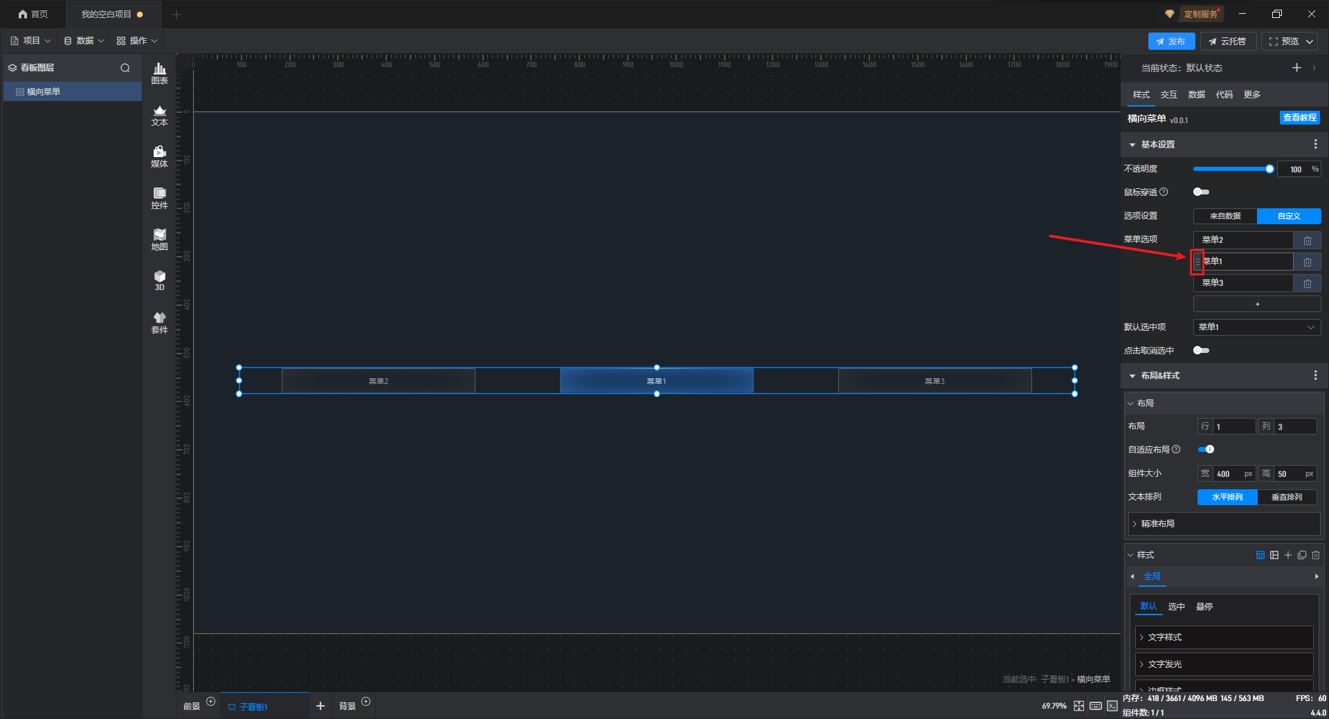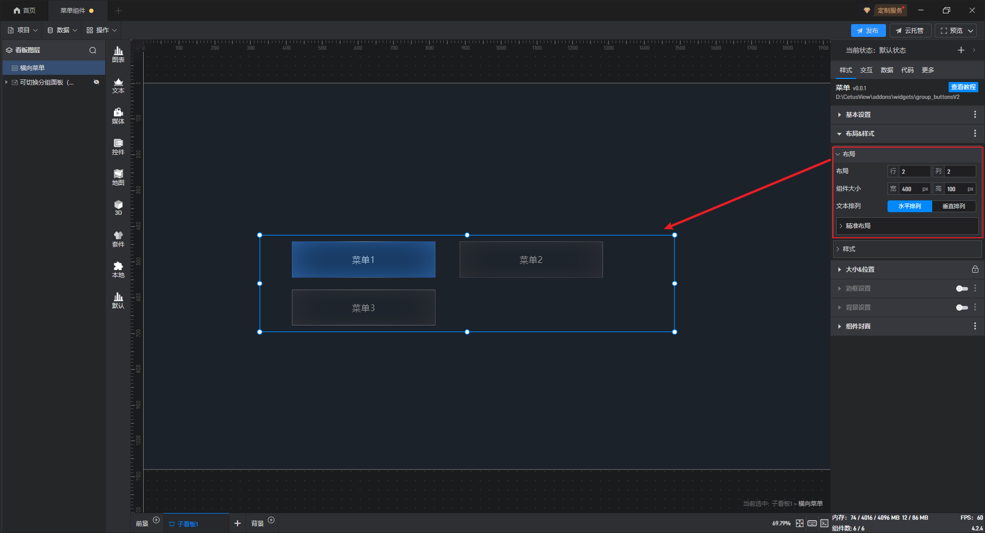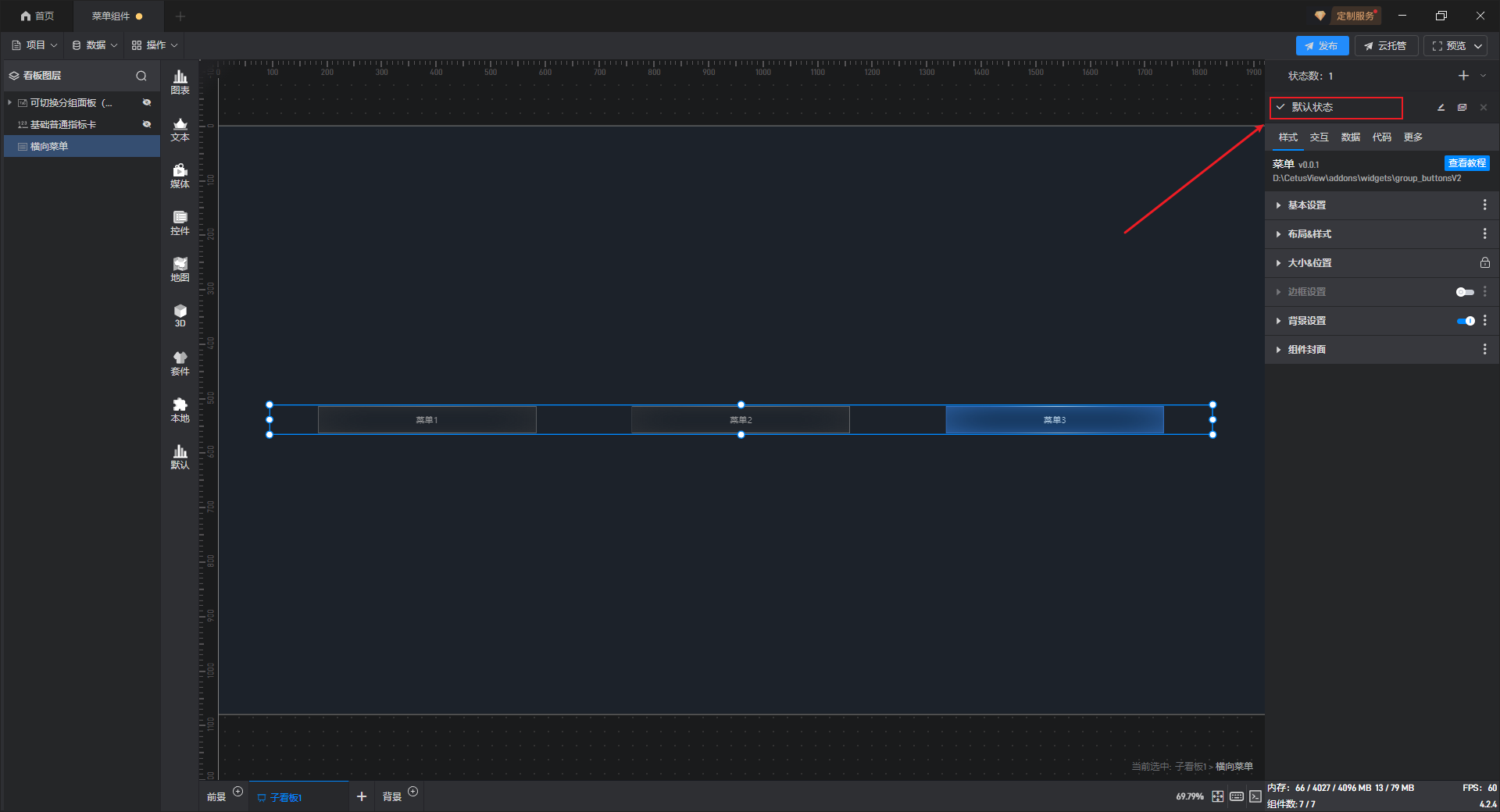 | 组件大小 | 自定义对菜单按钮的大小进行设置,默认组件的宽为“400px”、高为“50px”。 |