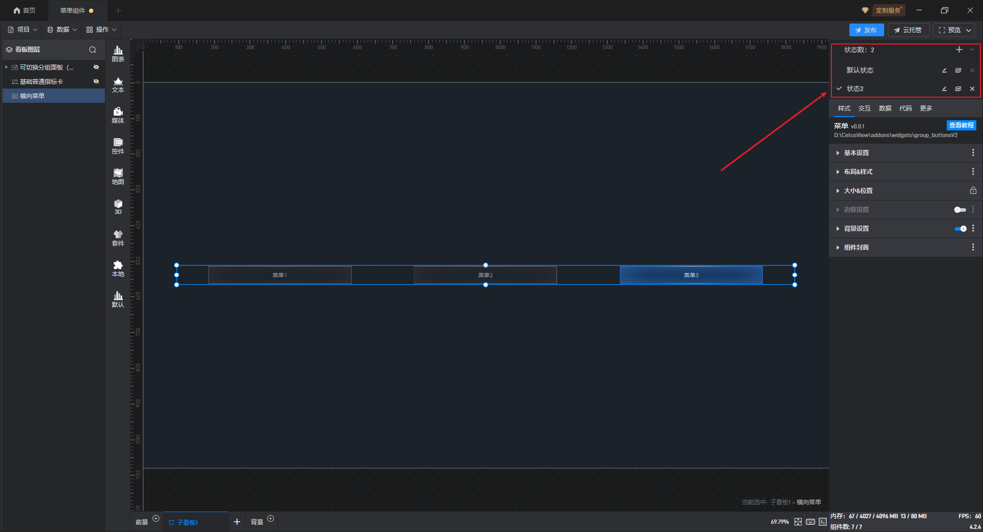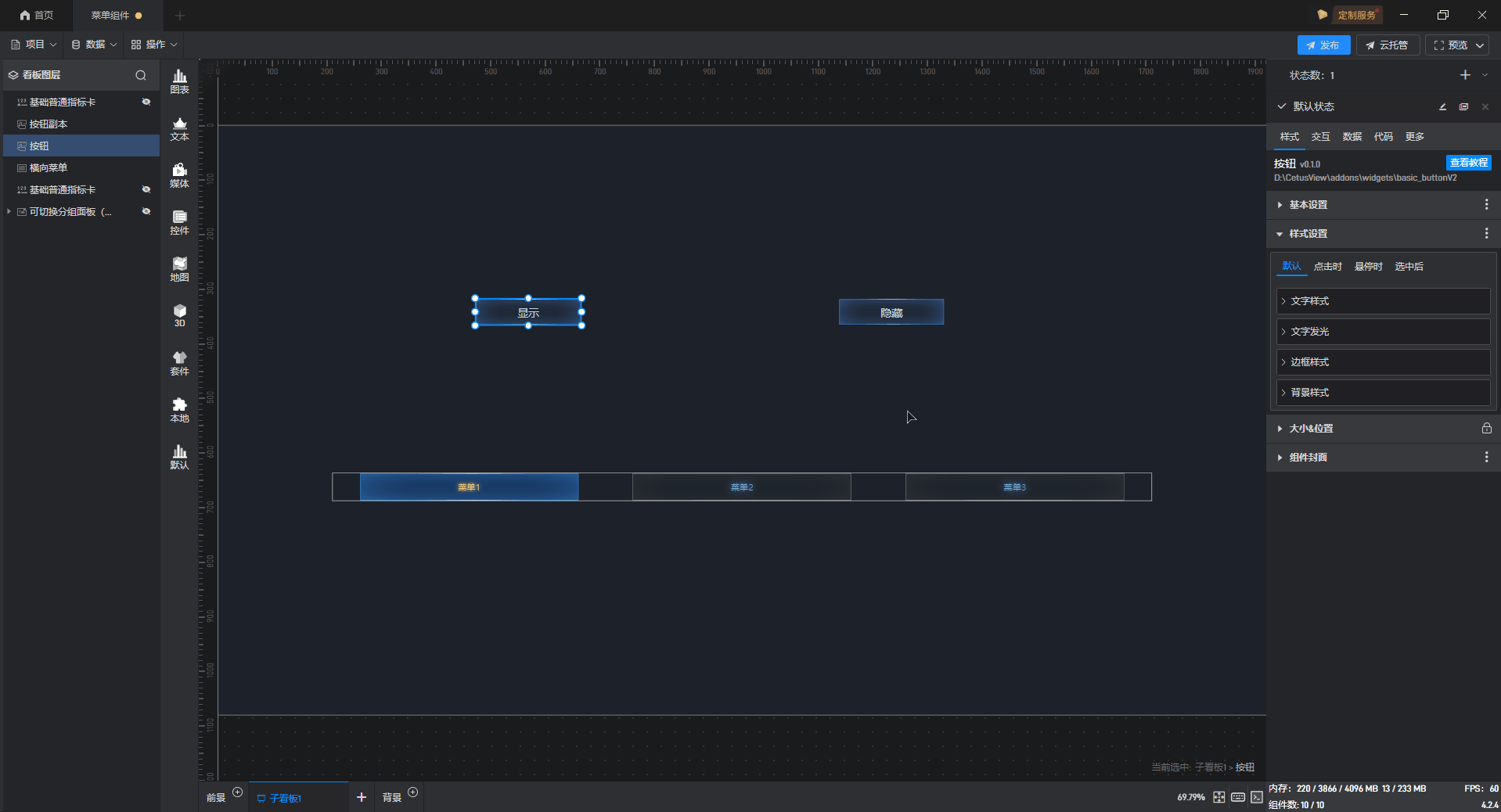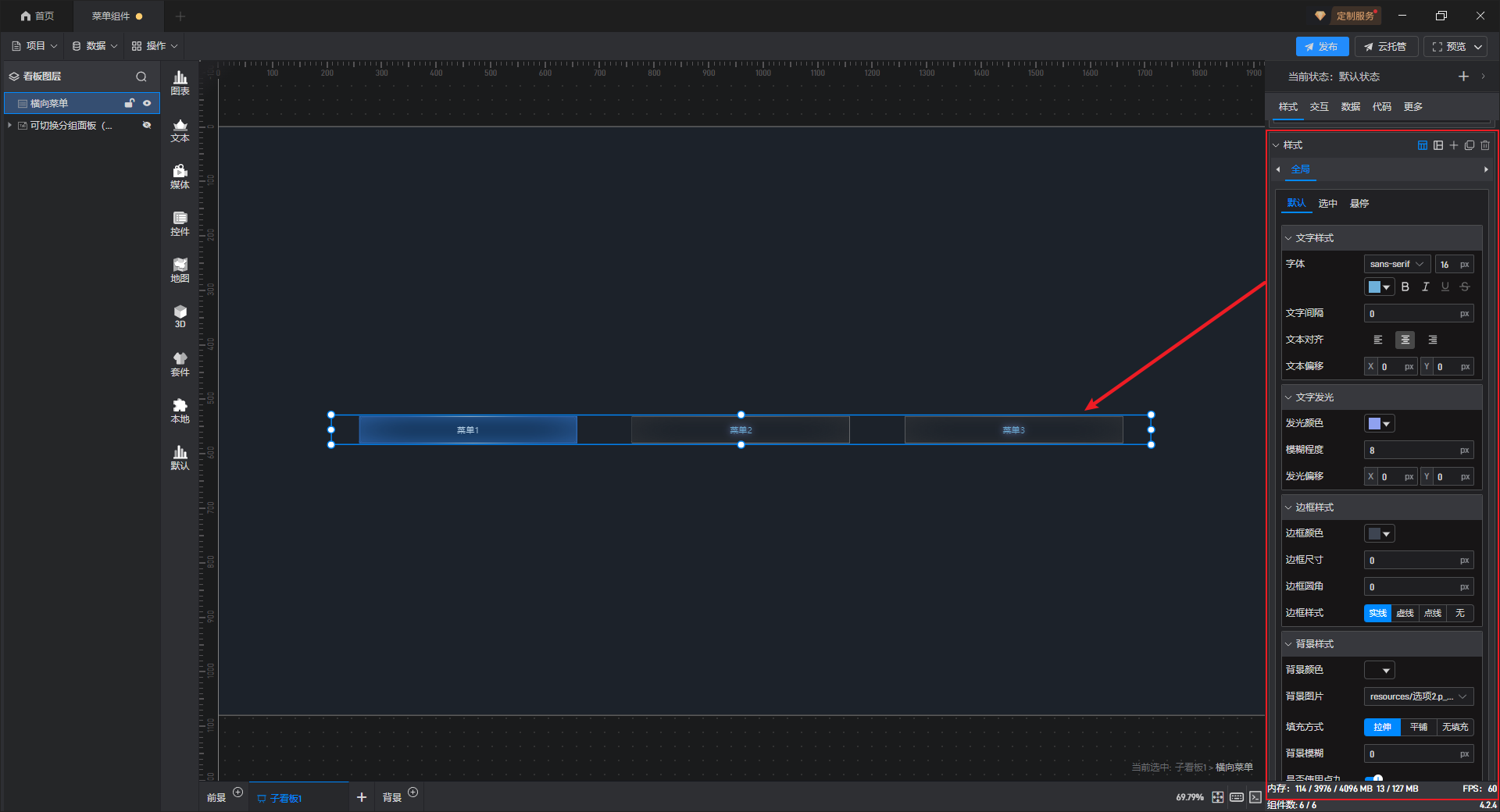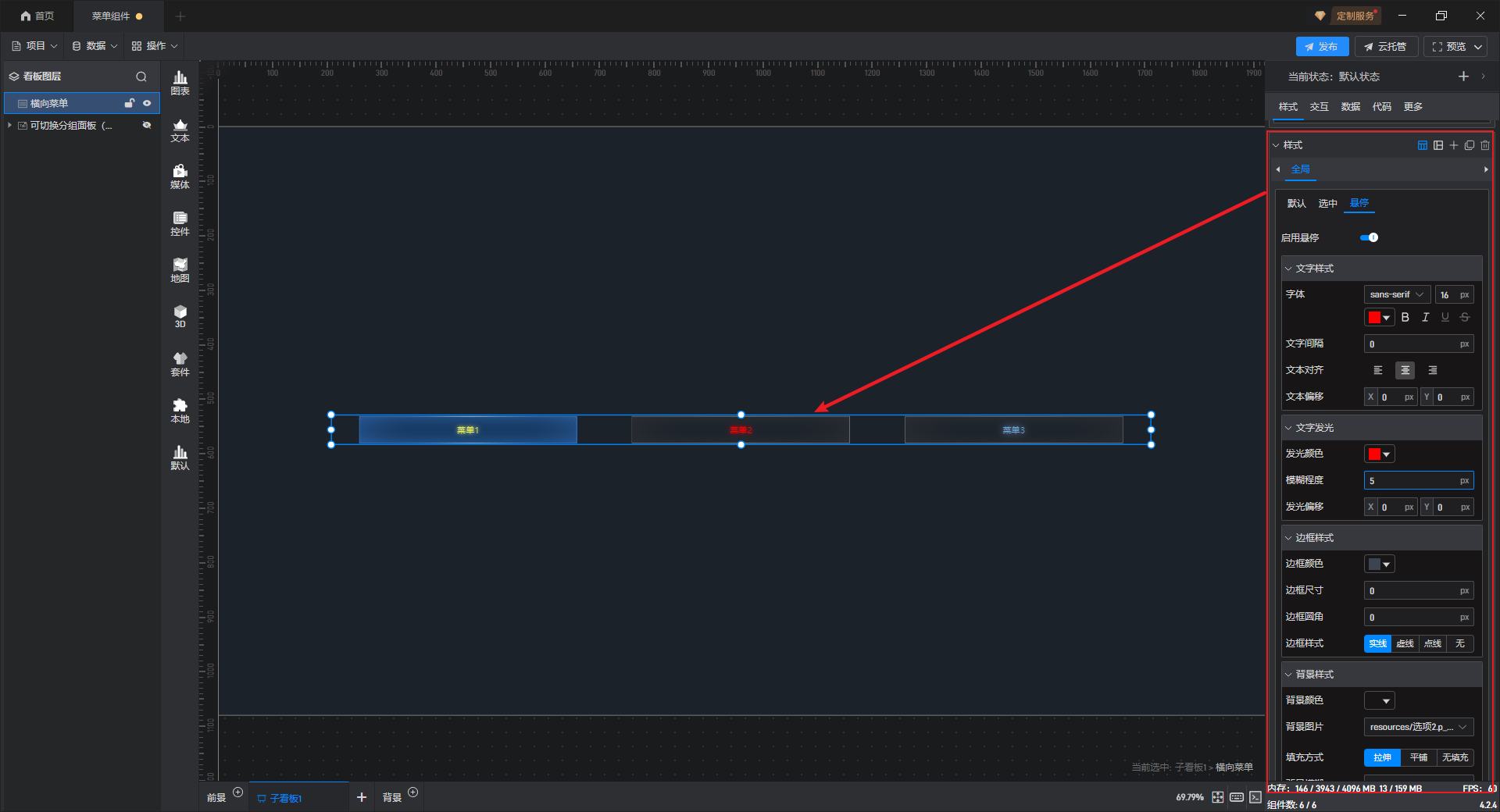 菜单按钮可设置“默认”、“选中”、“悬停”三个状态,每个状态分别对应一个“样式”。