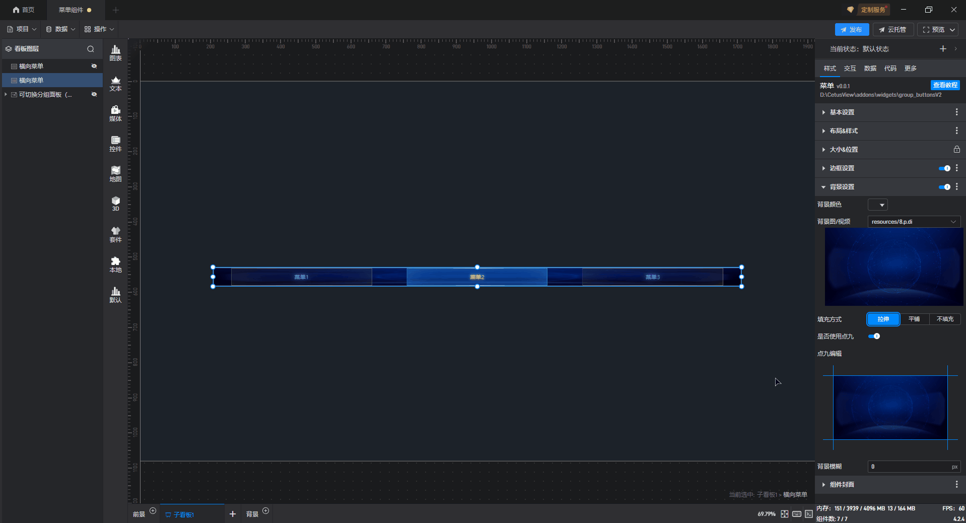 | 背景样式 | 可以对菜单按钮的“背景颜色”、“背景图片”、“填充方式”、“背景模糊”以及“是否使用点九”进行设置。其中“是否使用点九”设置项开启后,可以进行“点九编辑”,裁切选定背景图片的显示区域。 |