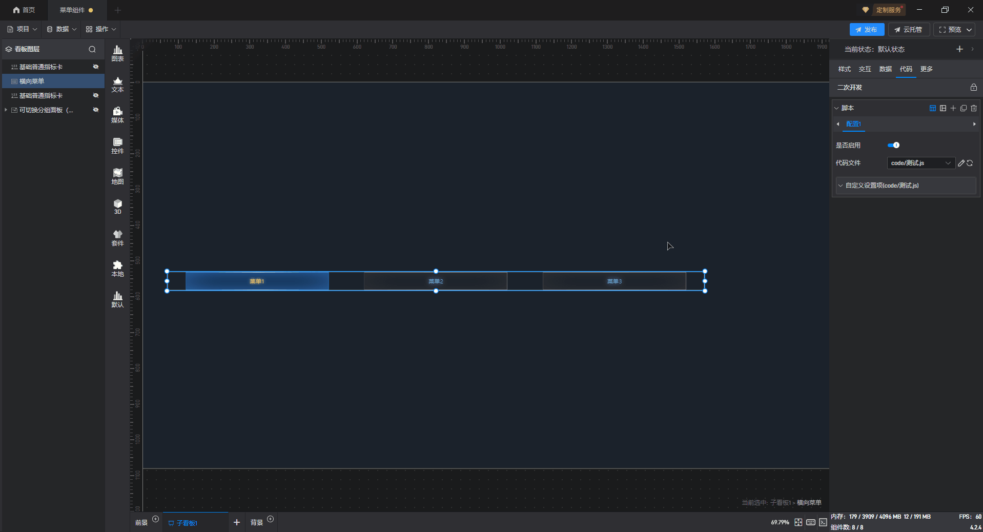 点击选中组件,在右侧设置窗口中切换到“代码”,可以对组件进行二次开发设置